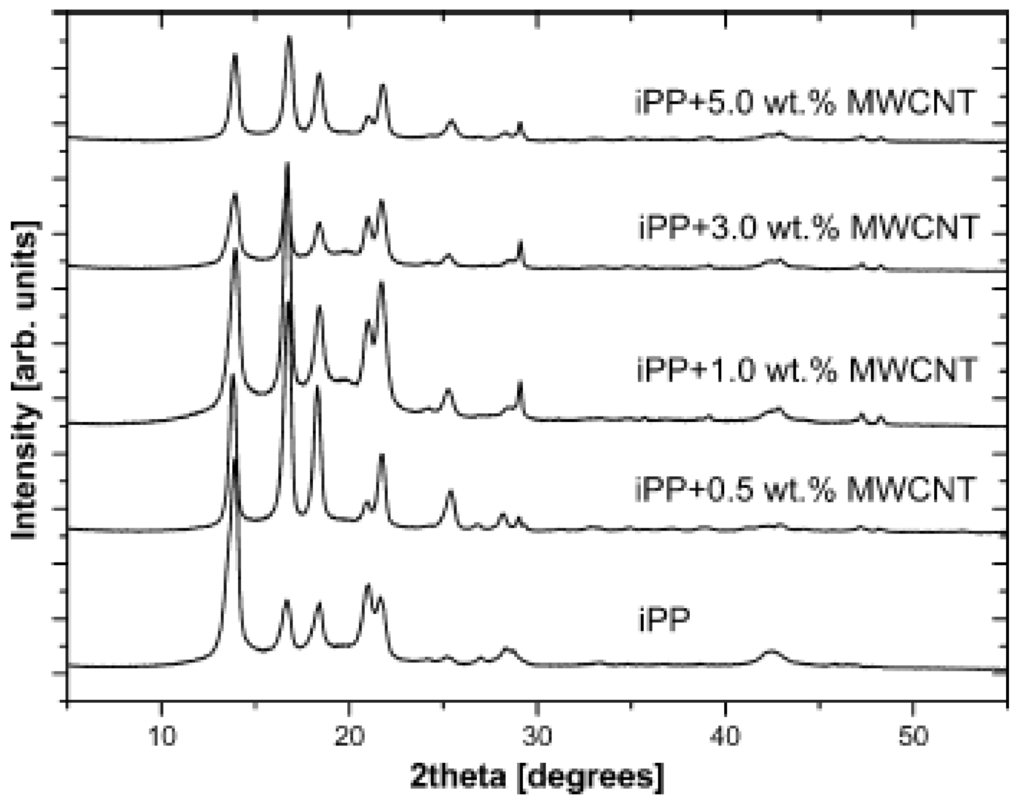 - Xu, D.; Wang, Z. Role of multi-wall carbon nanotube network in composites to crystallization of isotactic polypropylene matrix. Polymer 2008, 49, 330–338. [Google Scholar] [CrossRef]