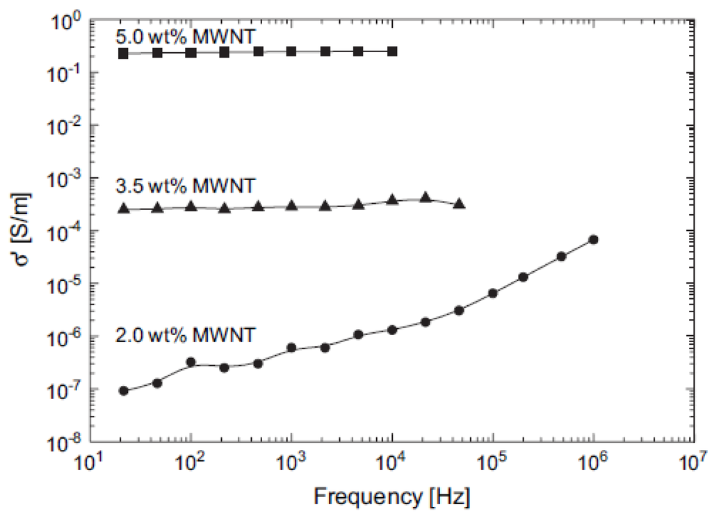 - Alig, I.; Lellinger, D.; Dudkin, S.M.; Pötschke, P. Conductivity spectroscopy on melt processed polypropylene-multiwalled carbon nanotube composites: Recovery after shear and crystallization. Polymer 2007, 48, 1020–1029. [Google Scholar] [CrossRef]