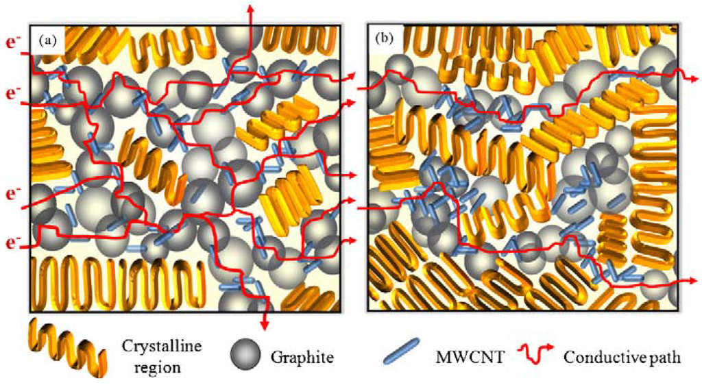 - Deng, H.; Skipa, T.; Zhang, R.; Lellinger, D.; Bilotti, E.; Alig, I.; Peijs, T. Effect of melting and crystallization on the conductive network in conductive polymer composites. Polymer 2009, 50, 3747–3754. [Google Scholar] [CrossRef]