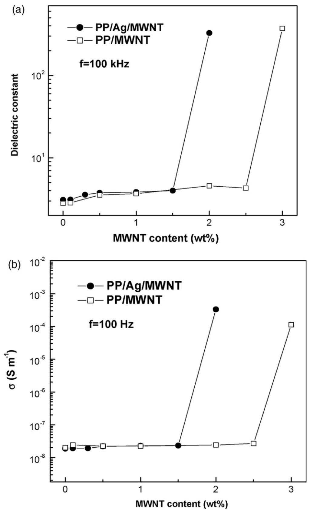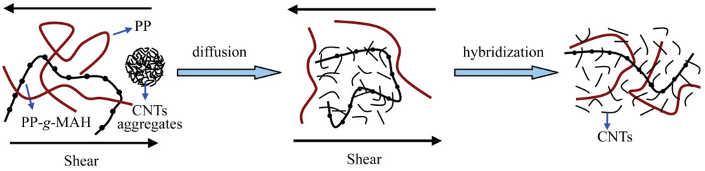 Investigations of PP nanocomposites fabricated with CNTs have been reported by many researchers [7,8,9,10]. However, it is well-known that the properties of polymer-based nanocomposites are strongly dependent on the dispersion of nanofillers.