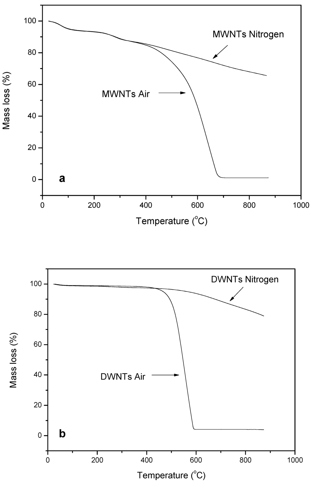 - Bom, D.; Andrews, R.; Jacques, D.; Anthony, J.; Chen, B.; Meier, M.S.; Selegue, J.P. Thermogravimetric Analysis of the Oxidation of Multiwalled Carbon Nanotubes: Evidence for the Role of Defect Sites in Carbon Nanotube Chemistry. Nano Lett. 2002, 2, 615–619. [Google Scholar] [CrossRef]
