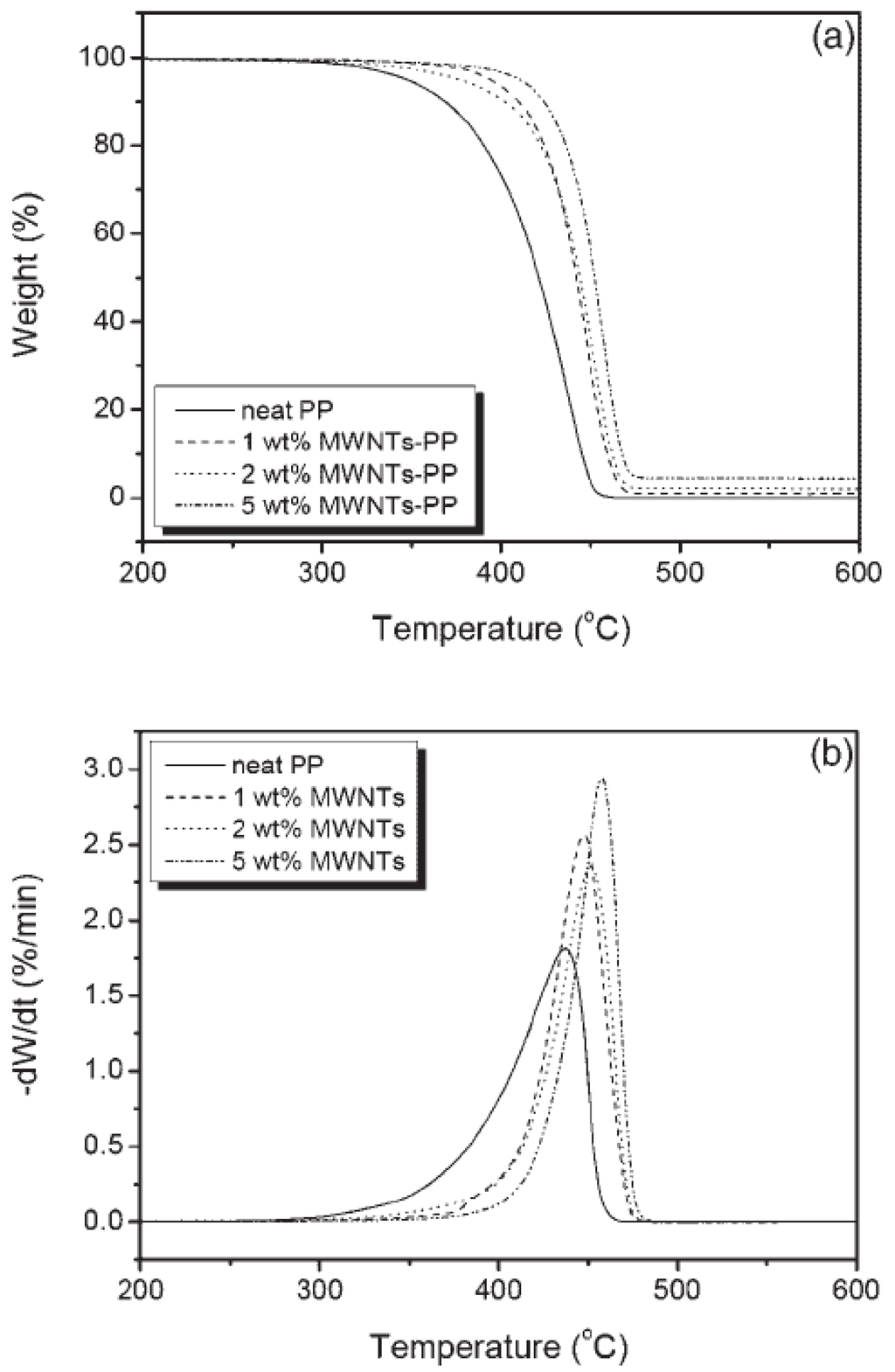 With the rapid development of nanotechnologies and nanomaterials since 1990s, studies on polymer-based nanocomposites have been extensively carried out in order to find promising alternatives to traditional composites, though these mainly focused on general mechanical and multifunctional properties and filler dispersion. In the case of PP nanocomposites, the most used filler is carbon nanotubes (CNTs). This is due to the unique combination of structural, mechanical, electrical, and thermal transport properties of carbon nanotubes (CNTs) [2], obtaining advanced multifunctional composite materials [3,4].