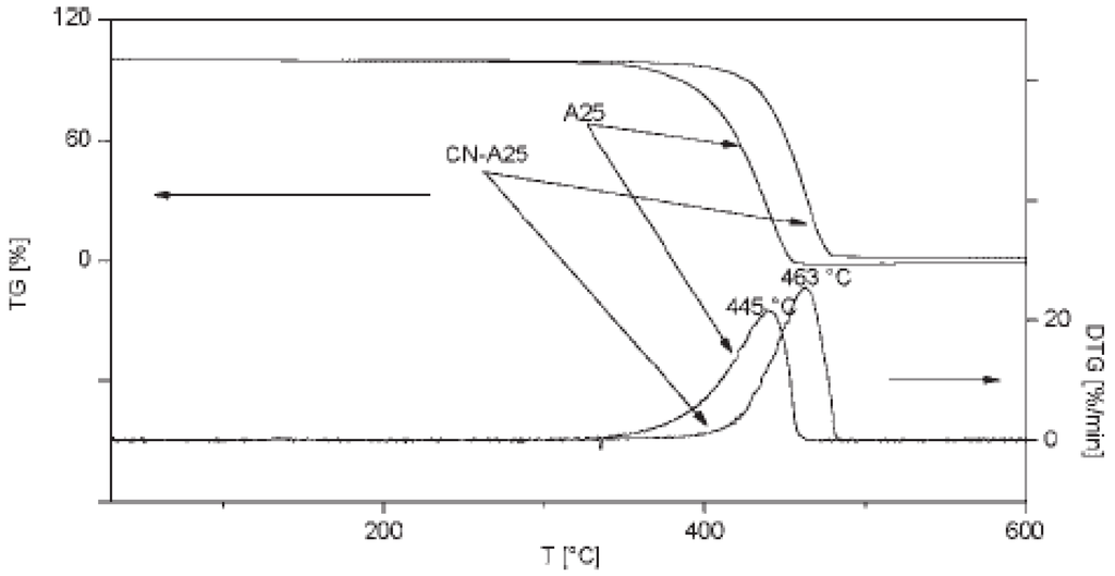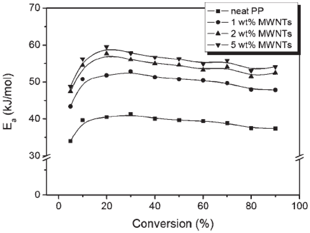 - Seo, M.K.; Park, S.J. A kinetic study on the thermal degradation of multi-walled carbon nanotubes-reinforced poly(propylene) composites. Macromol. Mater. Eng. 2004, 289, 368–374. [Google Scholar] [CrossRef]