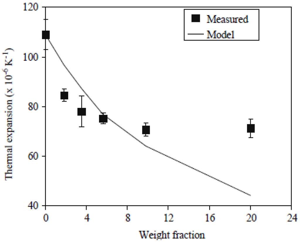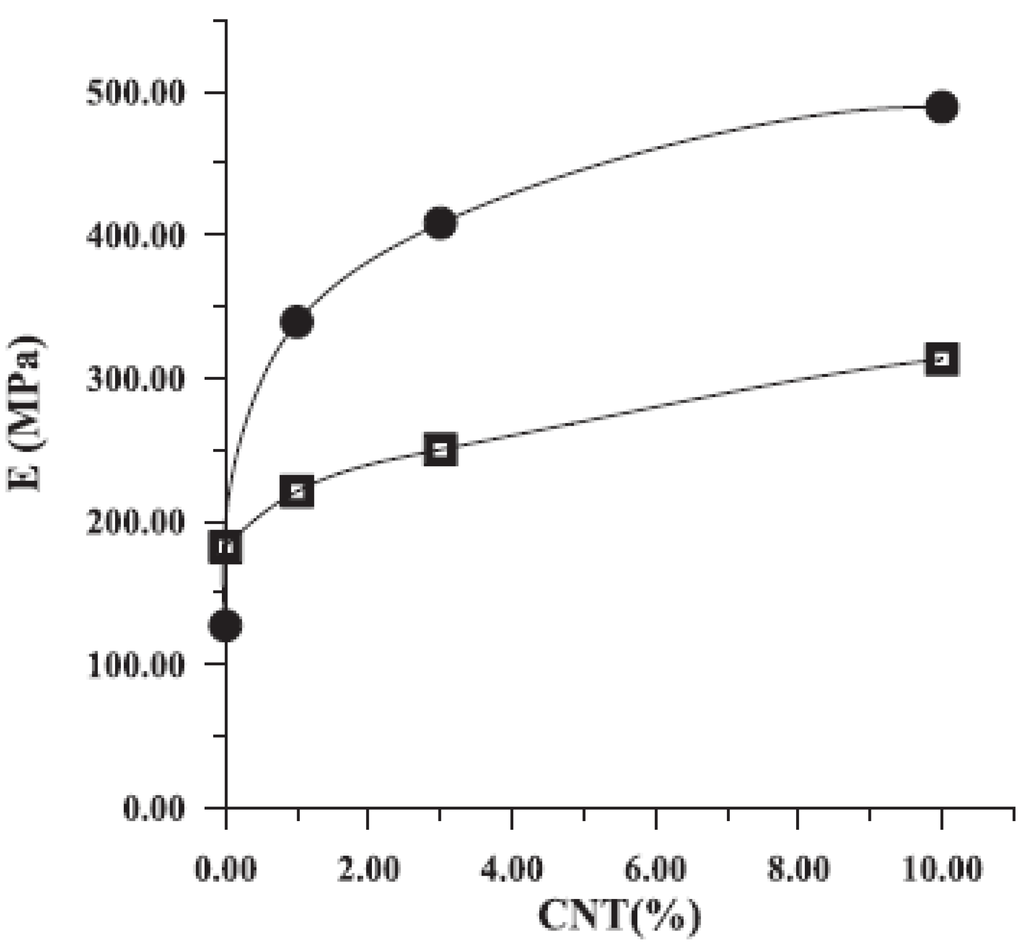 Tensile as well impact strength have a similar behavior in all nanocomposites containing CNTs. However, the most characteristic enhancement in mechanical properties gains the Young’s modulus. Figure 14 shows a comparison between the measured Young’s modulus of PP/CNTs composites and those predicted by the model [34].