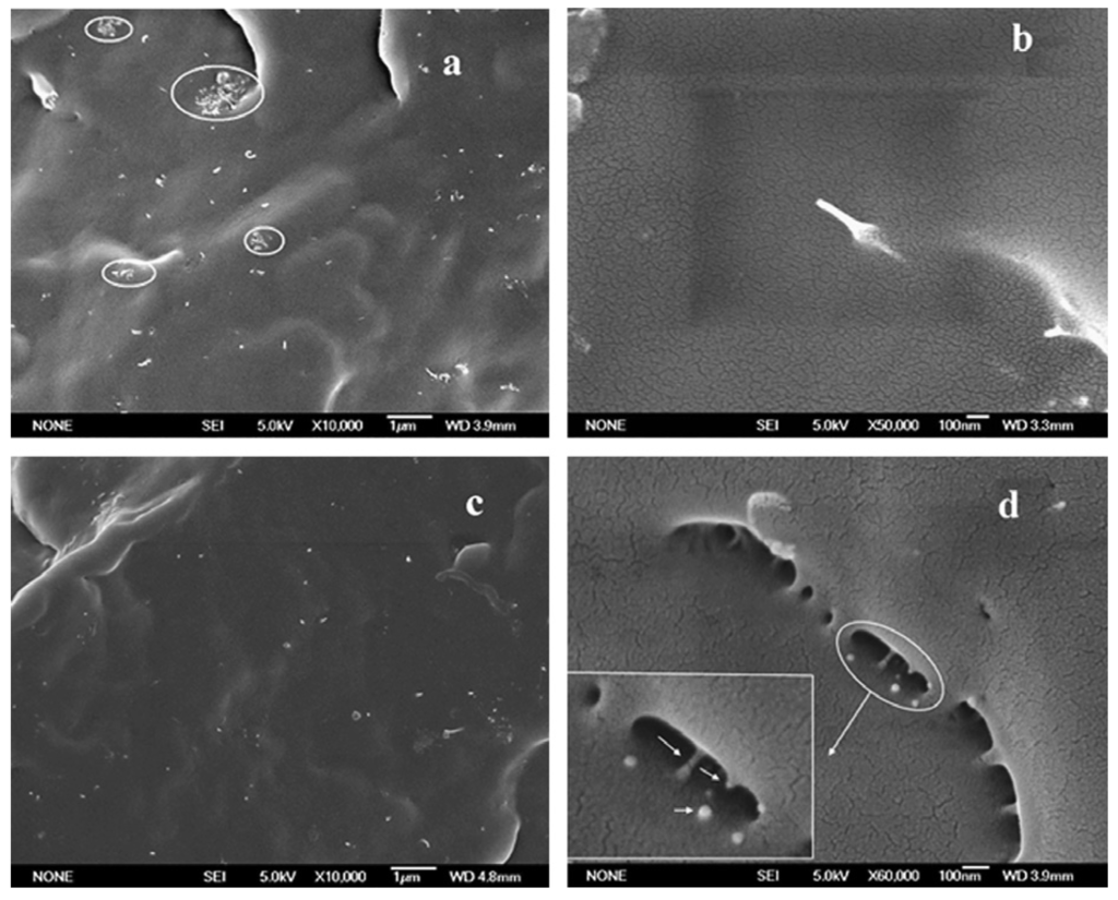 The study of PP/MWCNTs nanocomposites microstructure reveals the reinforcement effect of CNTs and was investigated in fractured surfaces in order to evaluate their effect on matrix deformation and the calculated mechanical properties [19]. As can be seen from the SEM images (Figure 15a) the matrix deformation is taking place with the investigation of fibrils. Furthermore, the network-density of the formed fibrils decreases in the nanocomposite with 0.5 wt % of MWCNTs when compared to pure PP, which indicates a drastic hindrance of the yielding process by MWCNTs despite plastic deformation, while still partly retaining the ductile nature of PP. With further increase of the MWCNTs content, the nanotube-rich areas become bigger and tend to show characteristics of forming an interconnecting network. When such network-density becomes higher at higher MWCNTs concentrations, they can potentially lead to intense strain localization because of hindered plastic deformation/strain of the matrix. The strain localization around the dense network of nanotubes, ultimately causes matrix cracking due to severe modulus mismatch between polymer and nanotubes and hence ductile yielding behavior is substantially reduced, i.e., semi-ductile behavior. Strikingly, when the MWCNTs content was increased further to 1.5 wt %, the network density of fibrils was almost negligible/absent and instead crack-growth on the matrix surface was seen to be spanned by nanotube bridging across the cracks assisted by network of fibrils. However, the formation of a rheologically percolated network above 1 wt % of MWCNTs completely changes the matrix behavior and, thus, the crack toughness of the nanocomposite with 1.5 wt % of MWCNTs becomes a dynamic interplay of percolation and nanotube bridging leading to a semi-ductile behavior. Thus, the drastic hindrance of the ductile yielding in the polymer is controlled by the state of dispersion of the MWCNTs, the interface and MWCNTs-induced structural reorganization (nucleation).