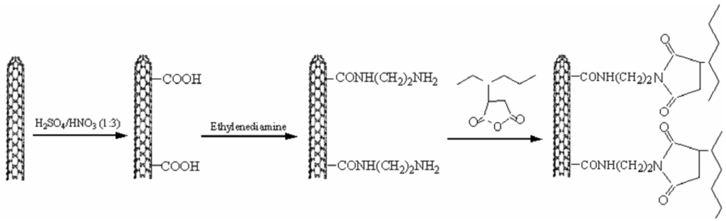 Carbon nanotubes are categorized as single-walled nanotubes (SWCNTs), multi-walled nanotubes (MWCNTs) and double-walled nanotubes (DWCNTs), which are of minor importance (Figure 1). Most SWCNTs have a diameter of close to 1 nm, with a tube length that can be many thousands of times longer. The structure of SWCNTs can be conceptualized by wrapping a one-atom-thick layer of graphite, called graphene, into a seamless cylinder. SWCNTs are a very important variety of CNTs because they exhibit important electric properties that are not shared by the MWCNTs variants. The MWCNTs consist of multiple layers of graphite rolled in on themselves to form a tube shape. MWCNTs, however, have a lower tensile strength and modulus than SWCNTs. Furthermore, SWCNTs have a shorter diameter (from 0.4 up to 5.6 nm) compared with MWCNTs, which is in the range of 10-100 nm. MWCNTs are also more rigid, because their section is much larger compared to that of SWCNTs.