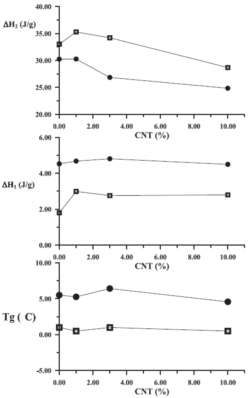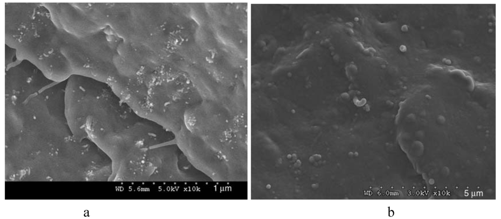 The microstructure of iPP/MWCNTs nanocomposite fractured surfaces studied by SEM analysis reveals different filler dispersion efficiency achieved in various composite systems [12,13]. From the micrographs in Figure 2, it can be seen that composites with different MWCNTs contents exhibited different MWCNTs dispersion state. At low MWCNT content, most of the MWCNTs dispersed individually in the iPP matrix. At relatively high MWCNTs contents, MWCNTs aggregates appeared in the polymer matrix, and the size of the aggregates increased with increasing MWCNTs content. [10,14]. Solid-state shear pulverization in conjunction with melt mixing was found that can produce well-dispersed polymer/MWCNTs nanocomposites [15,16].