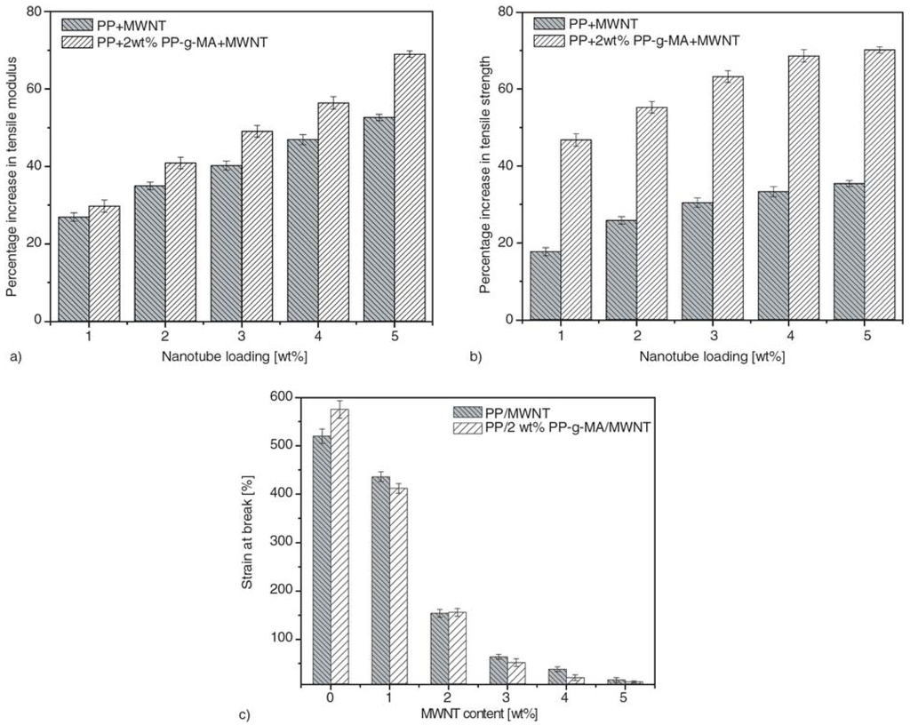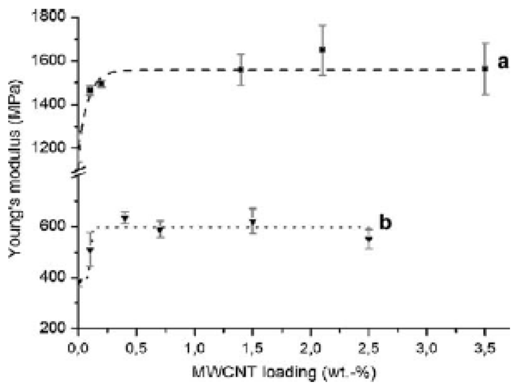 Evidences of stress transfer in polymer–nanotube composites are largely based on enhancement of modulus. Micromechanical analysis of the effective elastic properties based on the Mori–Tanaka approach was also applied, which was later compared with the results from finite-element modelling [28]. Based on these it was concluded that all the axial and transverse elastic properties are dominated by nanotubes and polymer matrix, respectively, while on the other hand the interphase effects greatly impact the transverse properties at low volume fractions. Composites containing 15 wt % fiber filling showed an improvement of the Young’s modulus of about 90%, which means in figures an increase from 410 N/mm2 for the pure PP to 780 N/mm2 for the nanofiber reinforced composite [29].