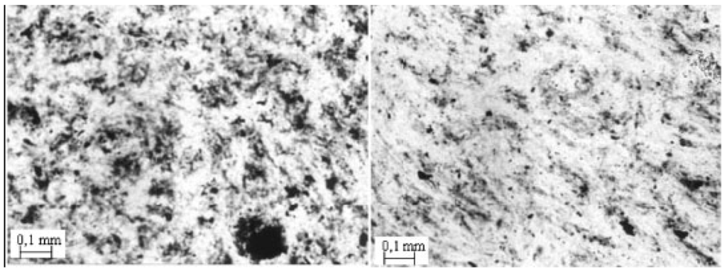 The agglomeration of nanotubes in clusters or clumps in the nanocomposite can be seen more clearly in an optical microscopy micrograph (Figure 3) [17,18]. As can be seen CNTs aggregates are observed as dark spots with a wide particle size distribution. Particles with sizes 0.5 up to 20 μm are visible. The particle sizes are mainly depended on the CNTs concentration. At low MWCNTs content they formed agglomerates are in lower magnitude and a better dispersion can be seen. The mean particle sizes are in the range of 0.2 up to 10 μm, while as MWCNTs content increases nanotubes forms larger agglomerates. This is due to the tendency of nanotubes to interact each other due to surface forces. CNTs during their formation have surface carboxyl groups and maybe some hydroxyl groups. These interact through hydrogen bonding or due to weak Van der Wall’s forces creating clusters and agglomerates. These are very difficult to break down during nanocomposites fabrication, since the involved forces during melt extrusion are not enough to break these agglomerates.