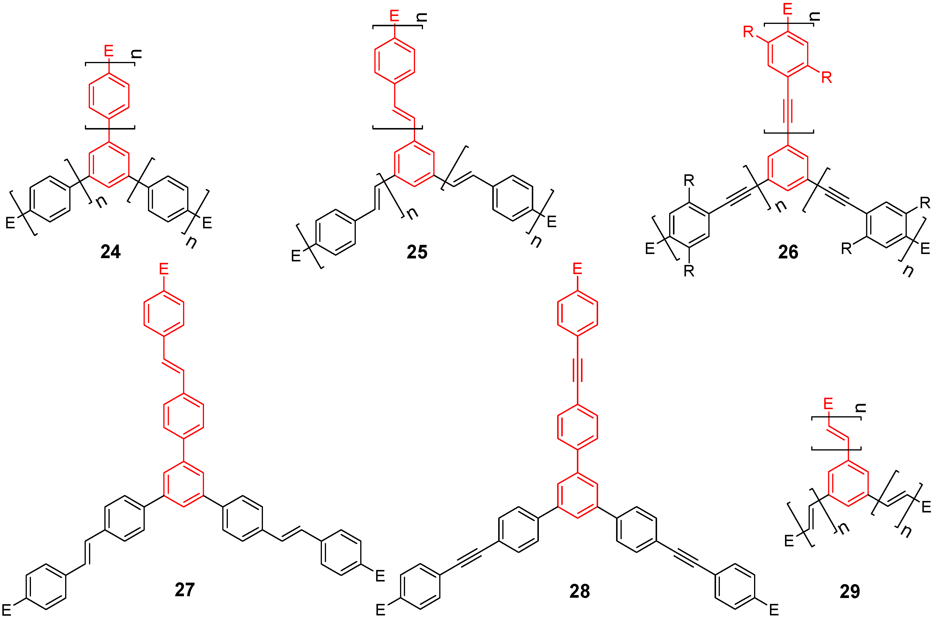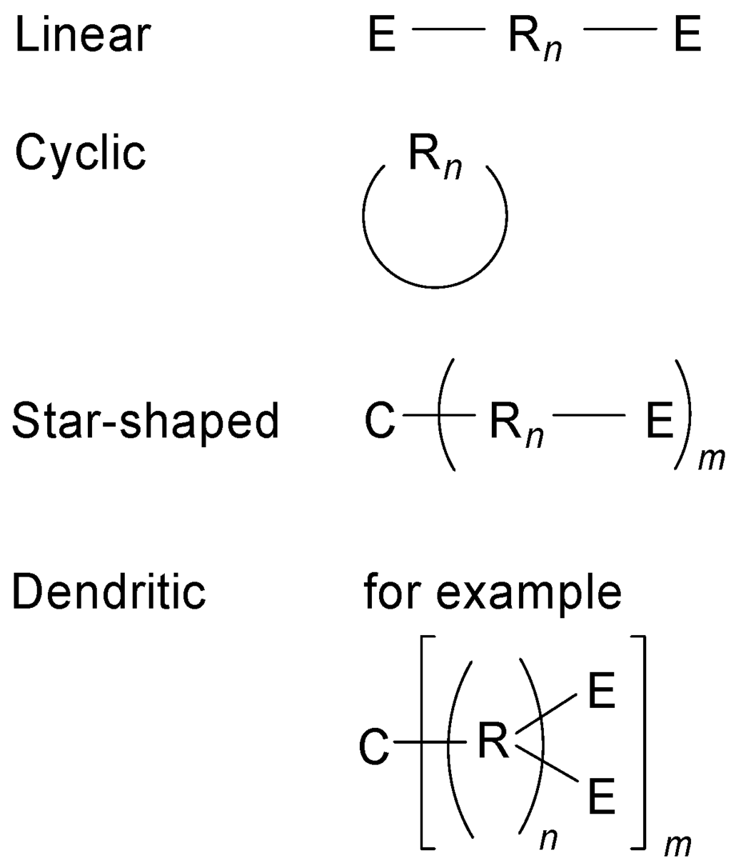 The conjugated oligomers can have linear, cyclic, star-shaped or dendritic structures (Figure 1). Apart from the repeat(ing) unit R, they can contain a core unit C and end groups E.