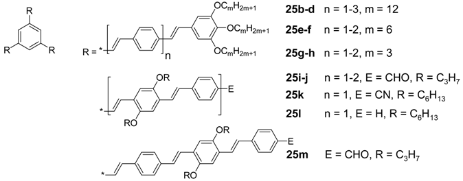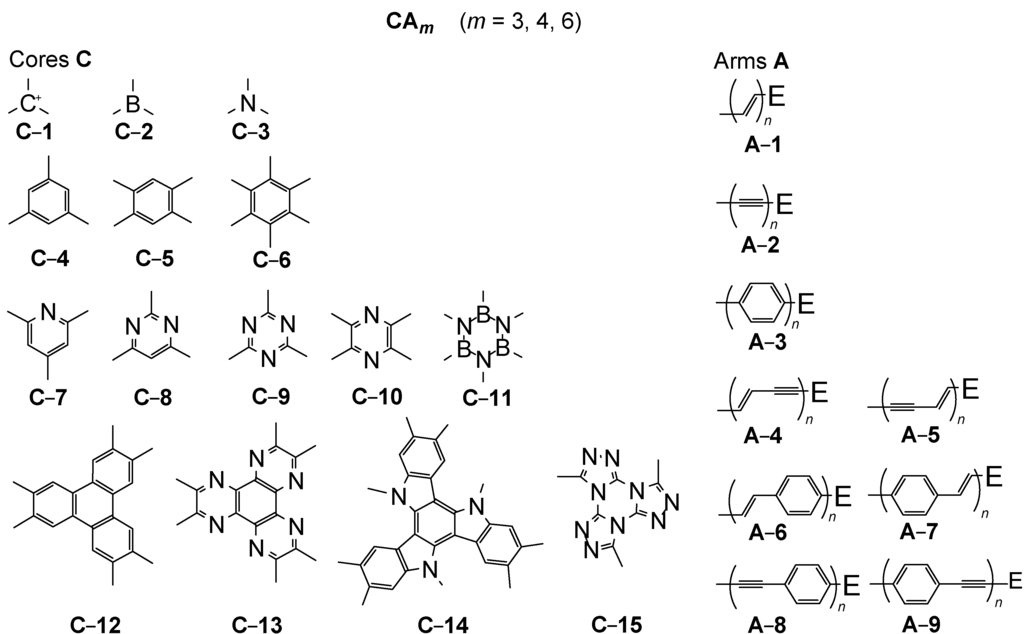The cores guarantee a cross-conjugation. Even single atoms, such as sp2-C, B or N (C-1 − C-3), can fulfill this precondition. More important are cores, which consist of benzene (C-4 − C-6), azine (C-7 − C-10) or borazine rings (C-11). The special arrangement of four conjugated arms on C-5 or C-10 is called a cruciform. Moreover, condensed ring systems, as for example triphenylenes (C-12), hexaazatriphenylenes (C-13), triazatruxenes (C-14) or tristriazolotriazines (C-15) have to be considered. The arms A are constructed by simple (A-1 − A-3) or composed (A-4 − A-9) repeat units, which convey a linear conjugation. The selected building blocks C-1 − C-15 and A-1 − A-9 would lead to 15 × 9 = 135 star-shaped oligomer series CAm. Many of them are still unknown − despite of intense efforts in this field in the previous two decades.