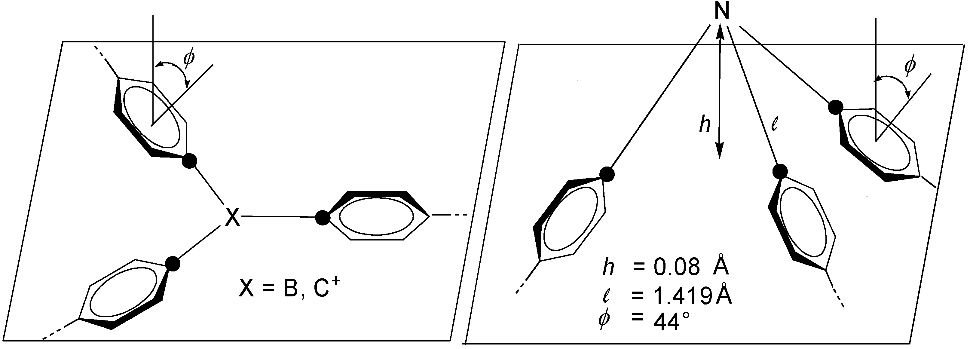 Triphenylborane can be taken as a model compound. According to its crystal structure analysis, the coplanar B-C bonds have an average length of 1.577 Å, their trigonal arrangement is characterized by bond angles of 120 ± 0.4° and the average torsion angle ϕ amounts to 30° [19]. This geometry guarantees the cross-conjugation by overlap of the pz (B) orbital and the π and π* orbitals of the three arms.