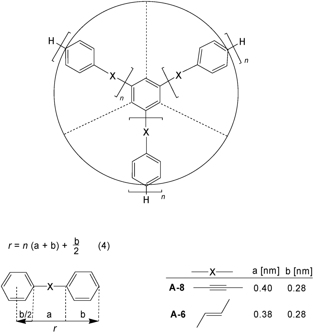 Due to their monodispersity and rigidity, star-shaped oligomers CAm have an exactly defined size and shape. Figure 4 demonstrates the situation for benzene cores C-4 with three arms A-6 or A-8. The radius r of the discs can be calculated by equation (4) and the parameters a and b given in Figure 4 [14]. Accordingly the diameter of these discs increases from about 1.6 nm for the first generation (n = 1) to about 5.6 nm for the fourth generation (n = 4). Torsions of the benzene rings do not change the size of the nanoparticles.