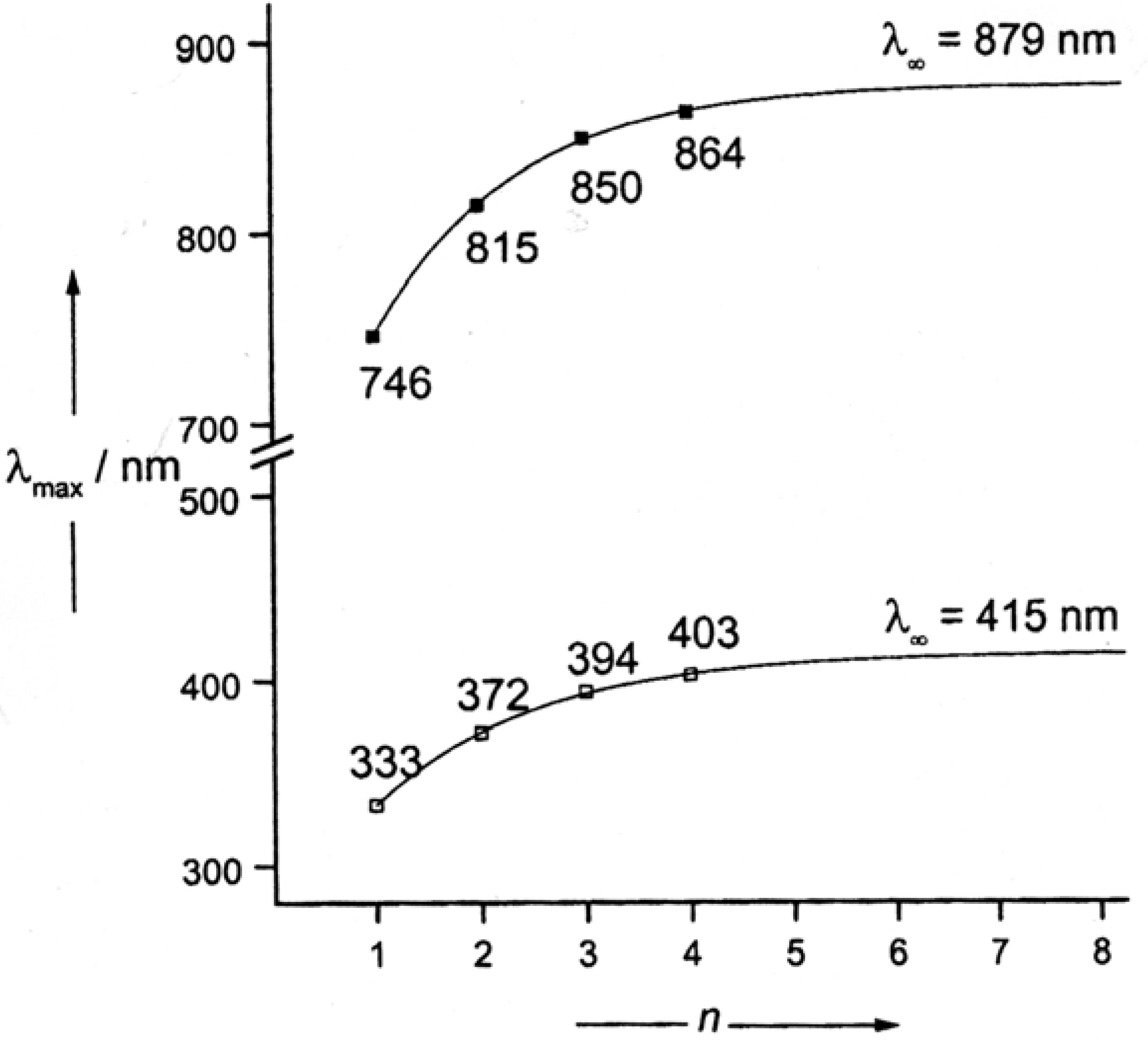 In “normal” series of conjugated oligomers, λmax(n) of long-wavelength absorption or emission bands increases monotonously with increasing numbers n of repeat units and approaches to a limiting value λ∞ [14,29]. The earlier used hyperbolic approximation, in which the excitation energy E is a function of the reciprocal number of repeat units n-1, does not sufficiently represent the saturation phenomenon. Some time ago, Meier et al. [28] suggested empirical exponential functions for the transition energy E(n), the λ (n) values, and the effective conjugation length (Equations 1-3).