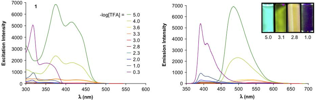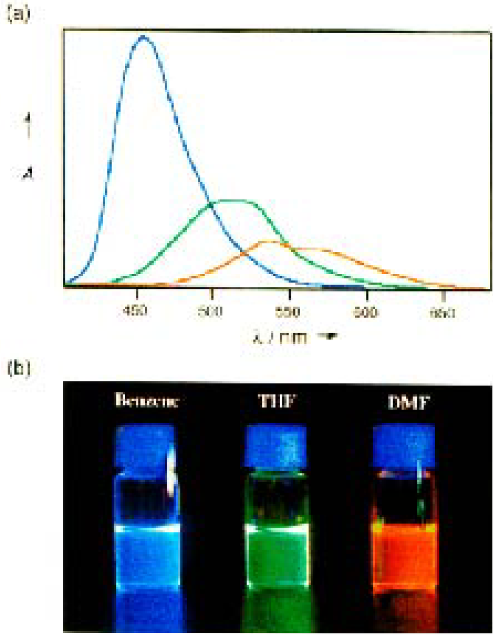 The crystal structure analysis [43] of 10a proved a trigonal planar boron center. The duryl groups are arranged in a propeller-like fashion. Their planes and the central boron plane form dihedral angles of 53-55°. The long wavelength absorption maxima (Scheme 3) are red-shifted by the extension of conjugation. The dimethylamino substituted compound 10d exhibits a strong push-pull effect with a significant solvatochromism of the fluorescence band. The blue emission color (λmax = 457 nm) in benzene changes to green (λmax = 512 nm) in THF, and to orange (λmax = 530 nm) in DMF (Figure 8). The fluorescence quantum yields of 10a-e in THF range between ϕF = 0.16 and 0.54 [43].