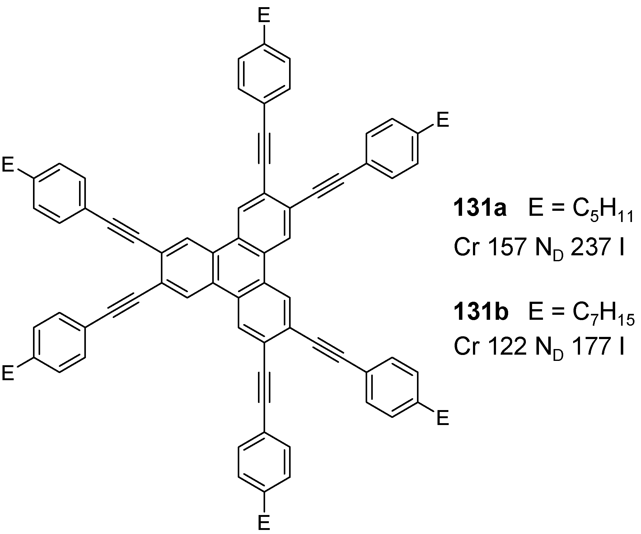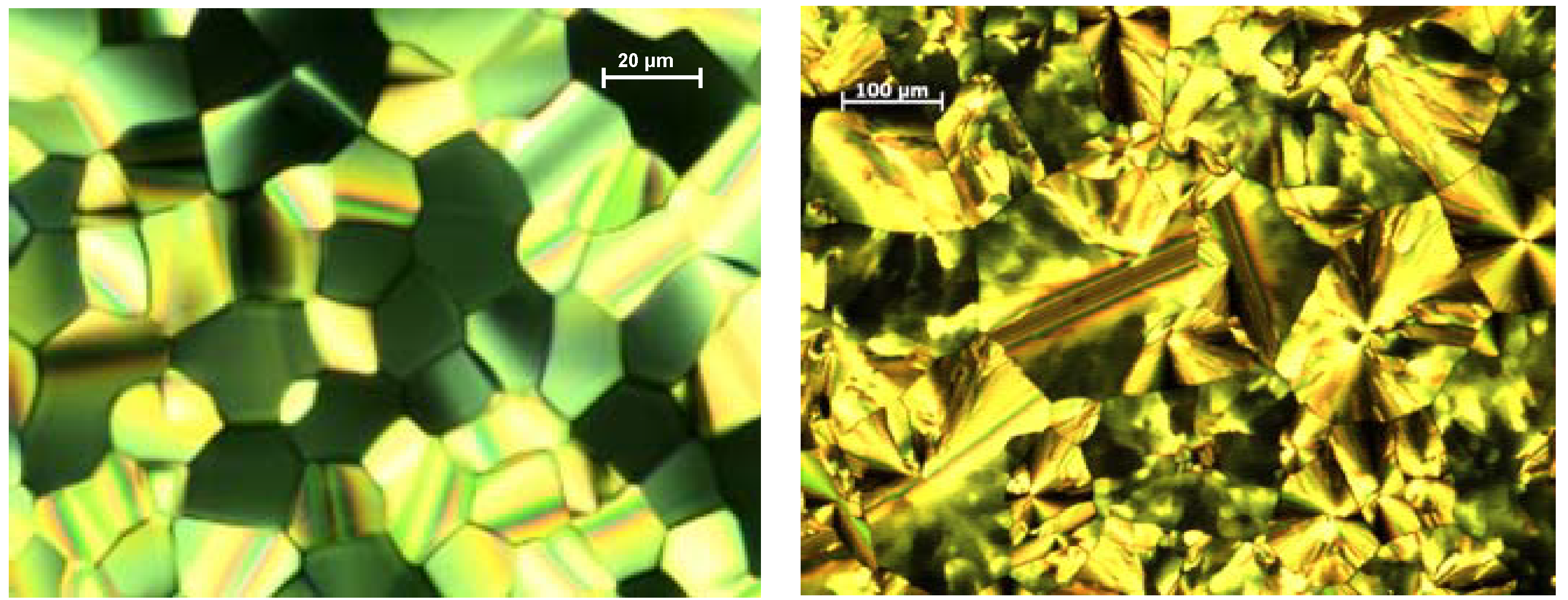 - Praefke, K.; Singer, D.; Kohne, B. New inductions of columnar mesophases in nematic multiyne mesogens. Liq. Cryst. 1993, 13, 445–454. [Google Scholar] [CrossRef]
