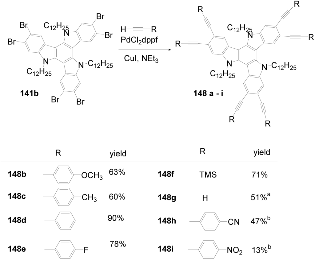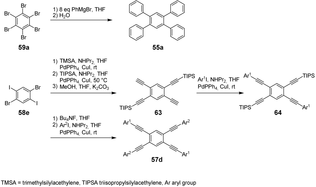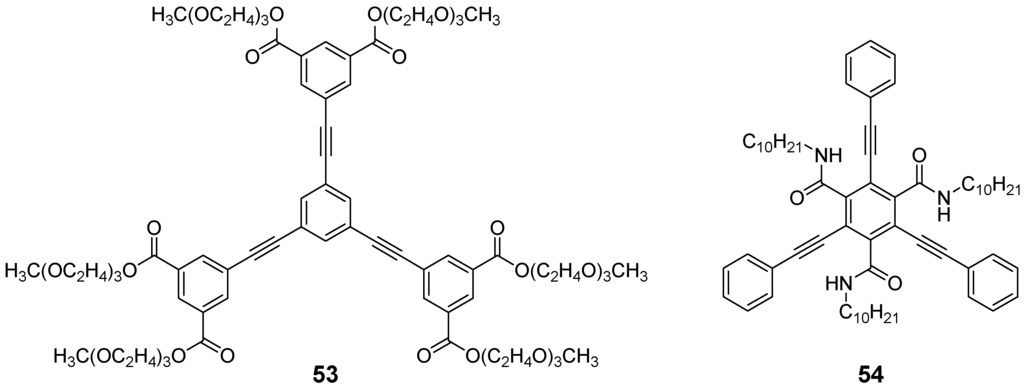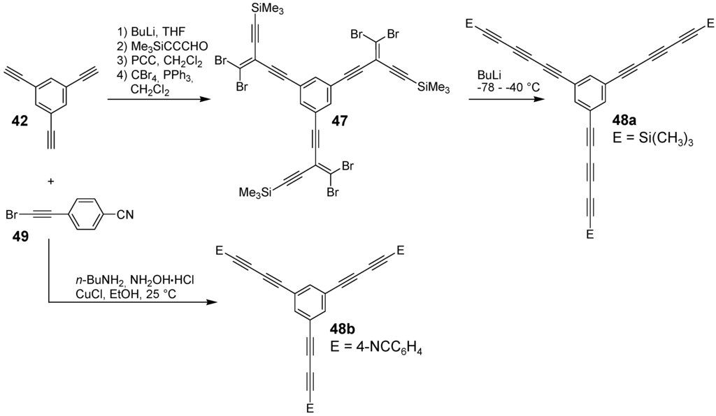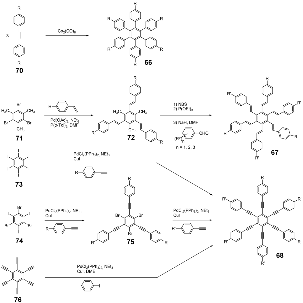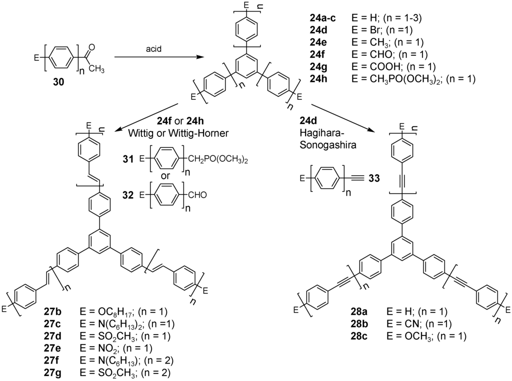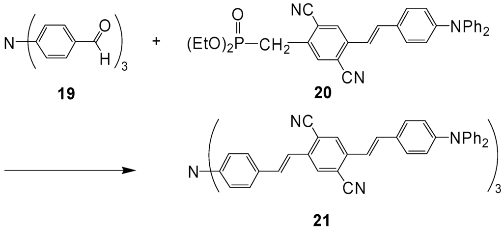 The synthetic approach to the star-shaped conjugated oligomers CAm comprises convergent and divergent strategies, protecting group techniques and orthogonal techniques-like in the other classes of conjugated oligomers [1,2,3,4,5,6,7,8,9,10,11,12,13,14,15,16,17,18]. Most important are catalyzed CC coupling reactions, such as Heck, Sonogashira or Suzuki reactions. Condensation reactions for the generation of CC double bonds and oxidative couplings of terminal alkynes play also an important role in this context.