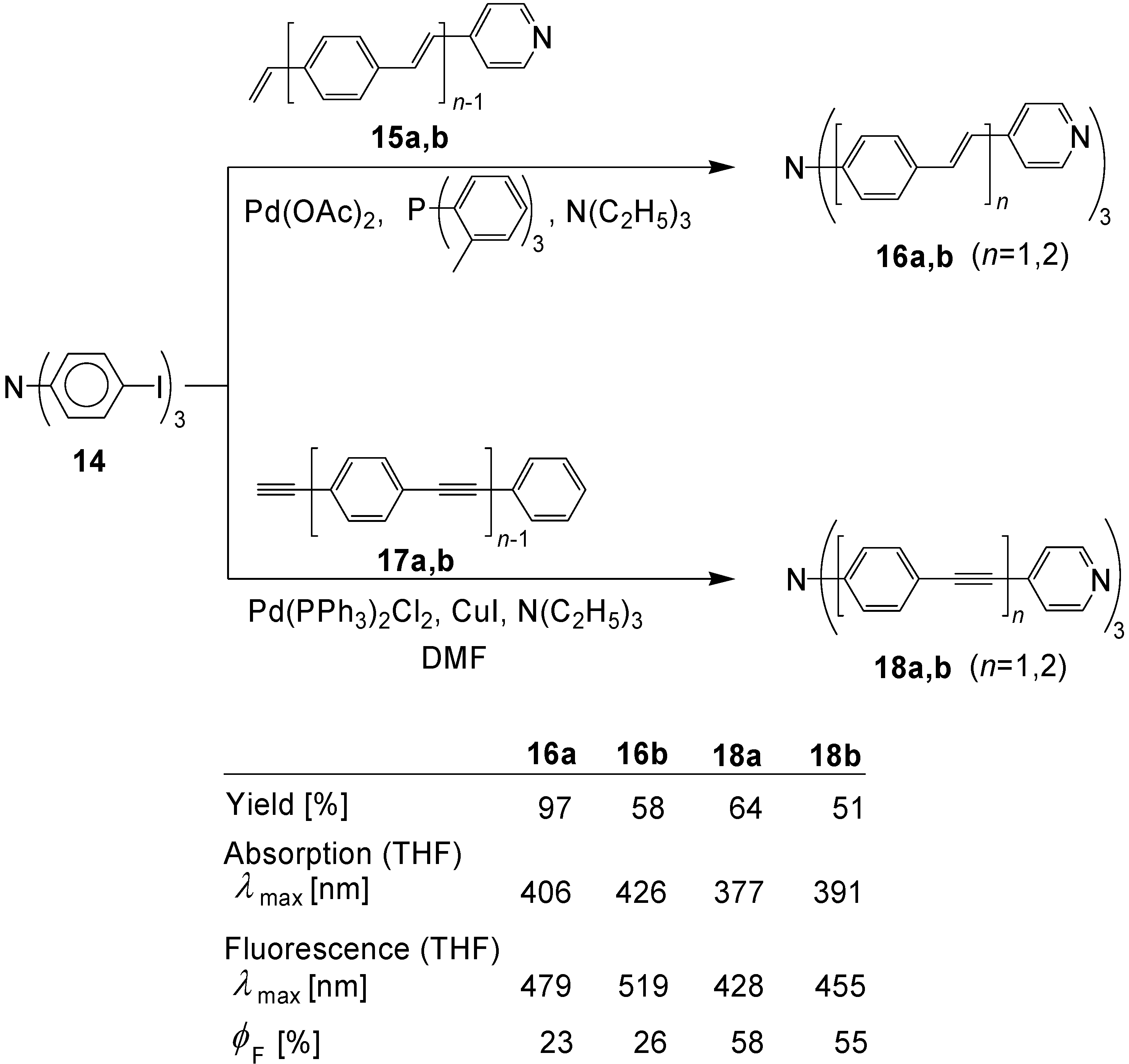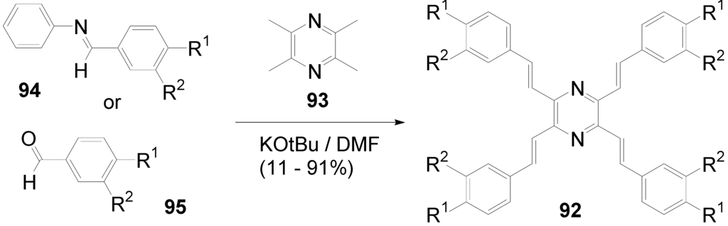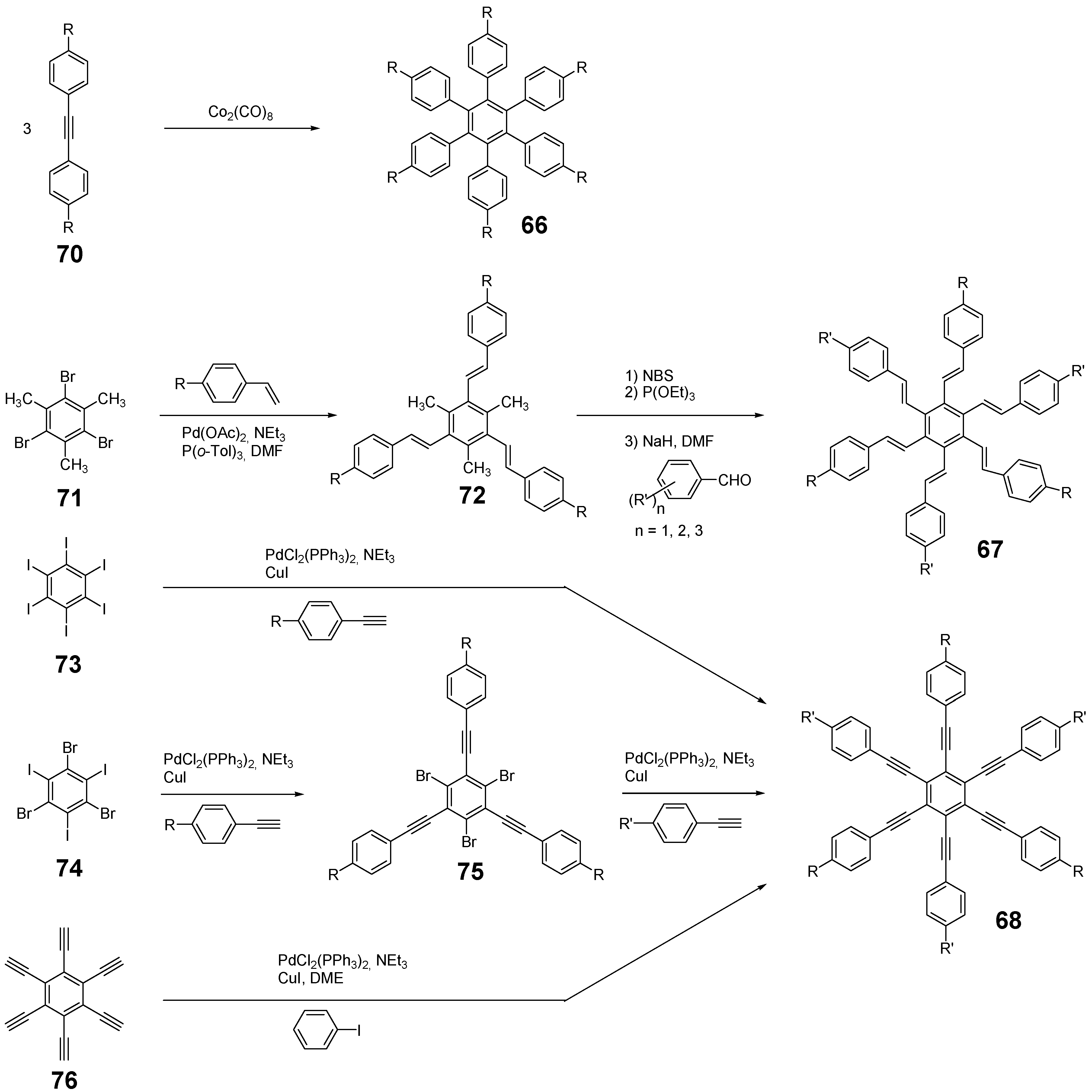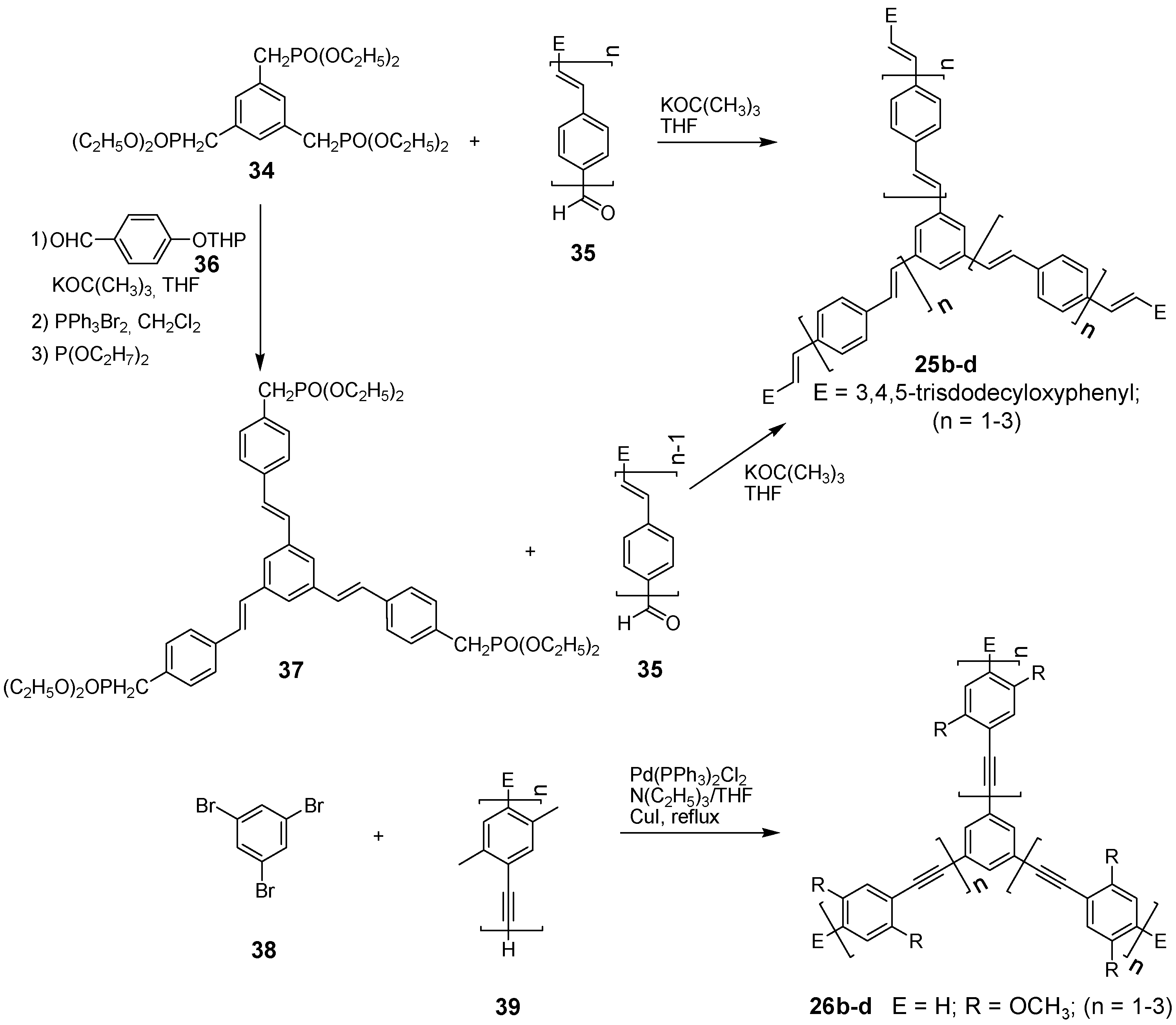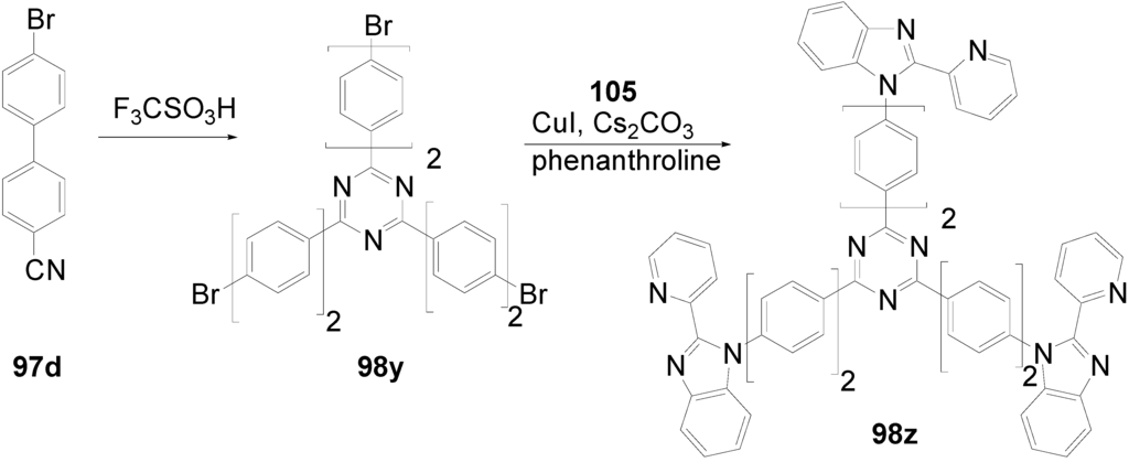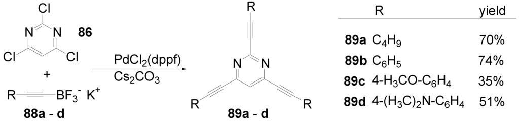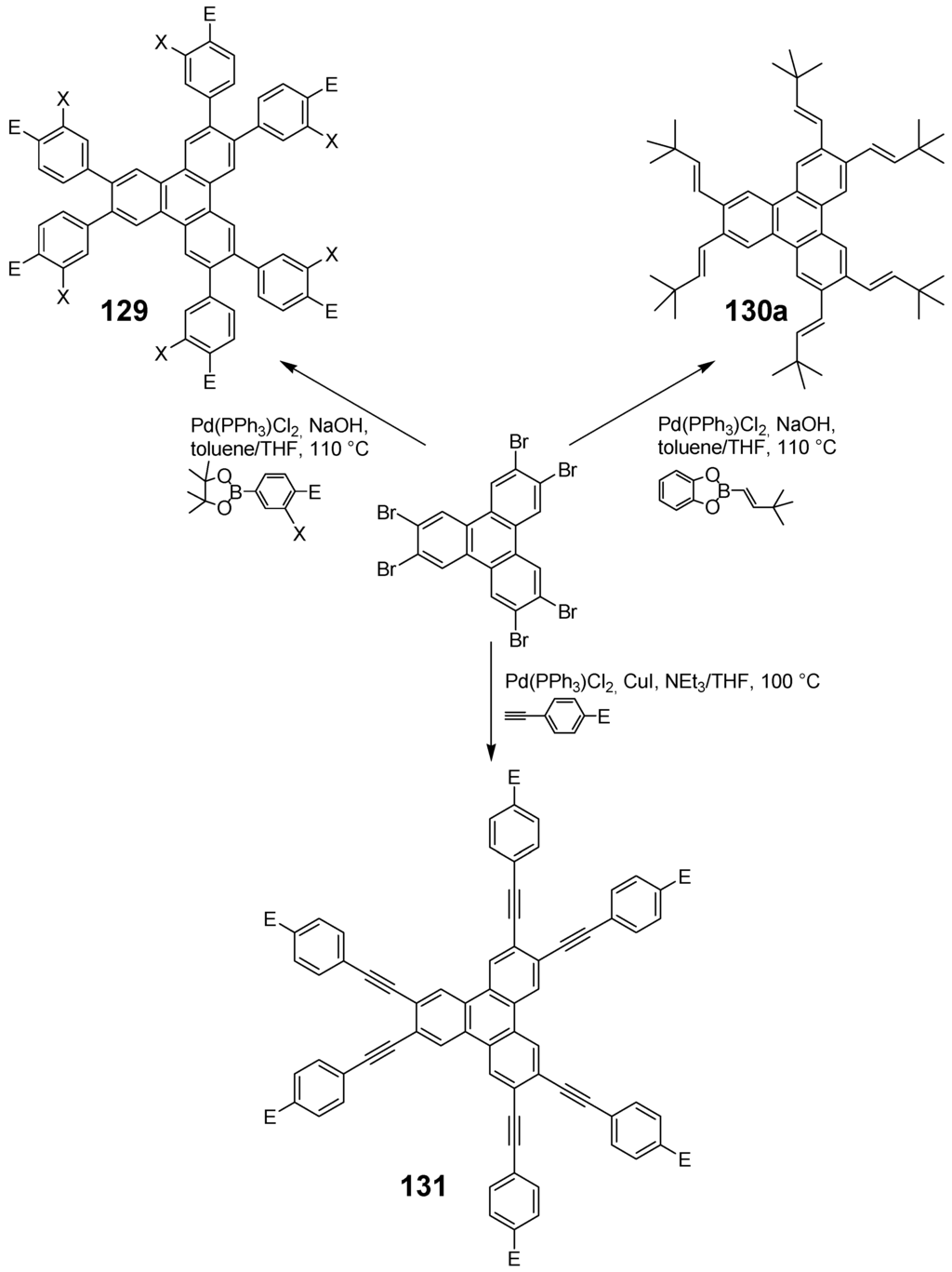 The synthetic approach to the star-shaped conjugated oligomers CAm comprises convergent and divergent strategies, protecting group techniques and orthogonal techniques-like in the other classes of conjugated oligomers [1,2,3,4,5,6,7,8,9,10,11,12,13,14,15,16,17,18]. Most important are catalyzed CC coupling reactions, such as Heck, Sonogashira or Suzuki reactions. Condensation reactions for the generation of CC double bonds and oxidative couplings of terminal alkynes play also an important role in this context.