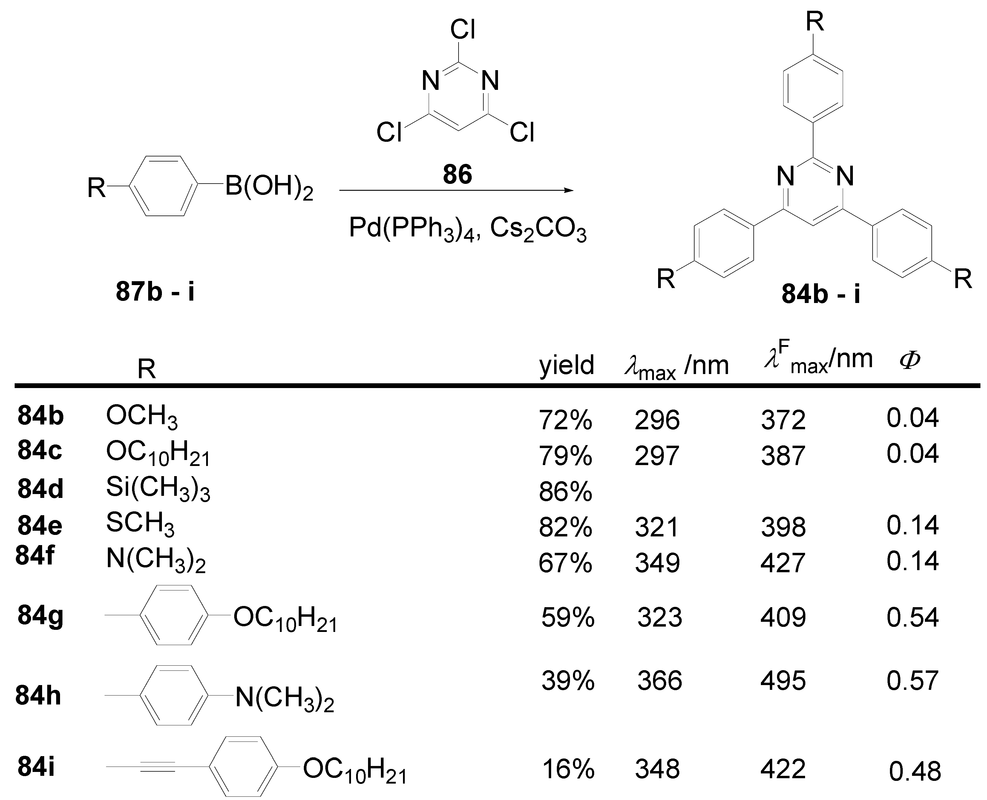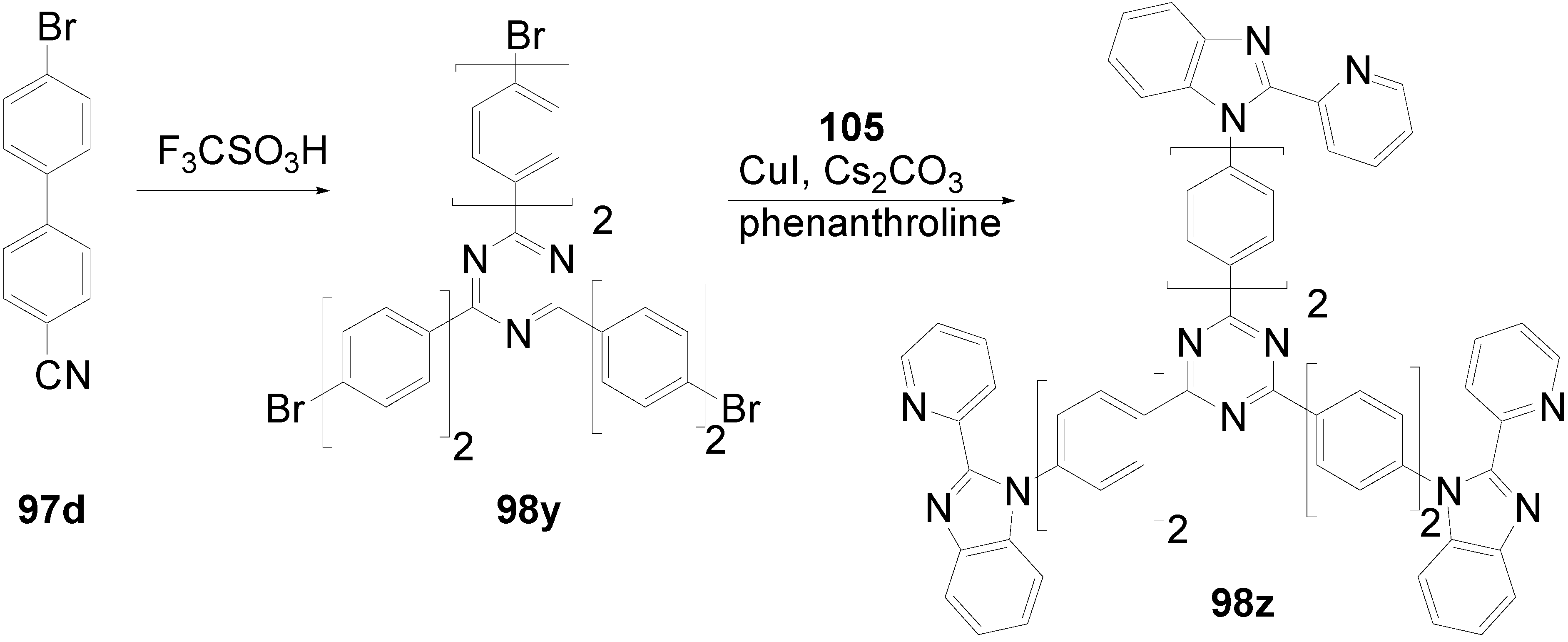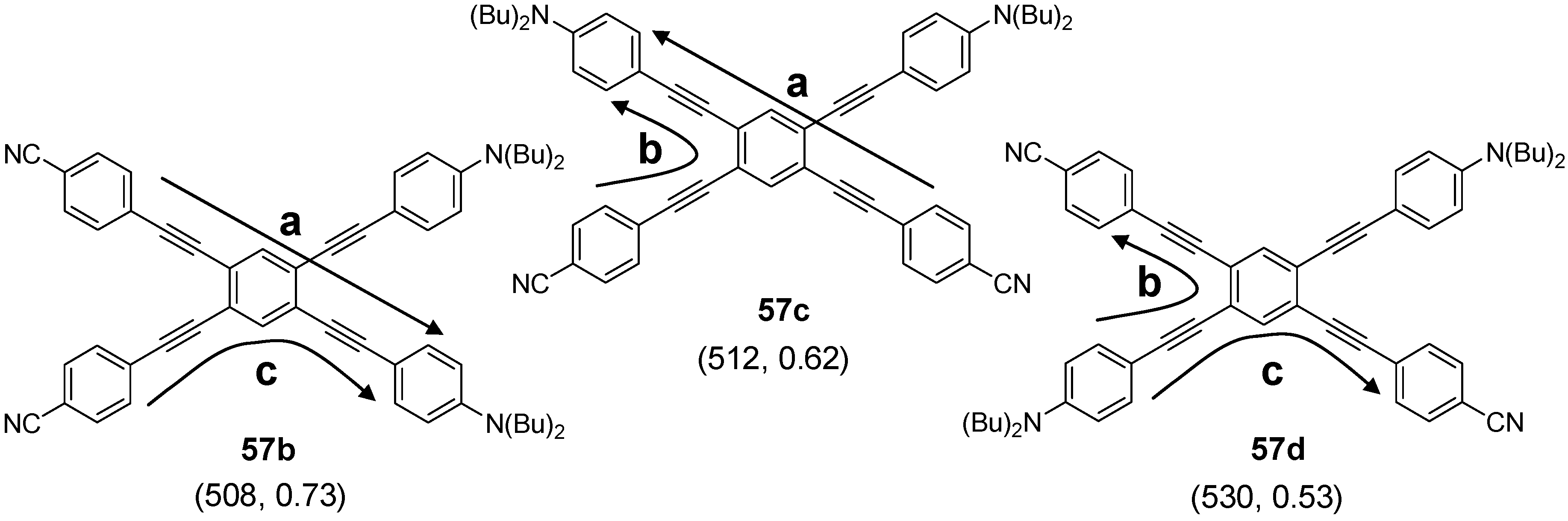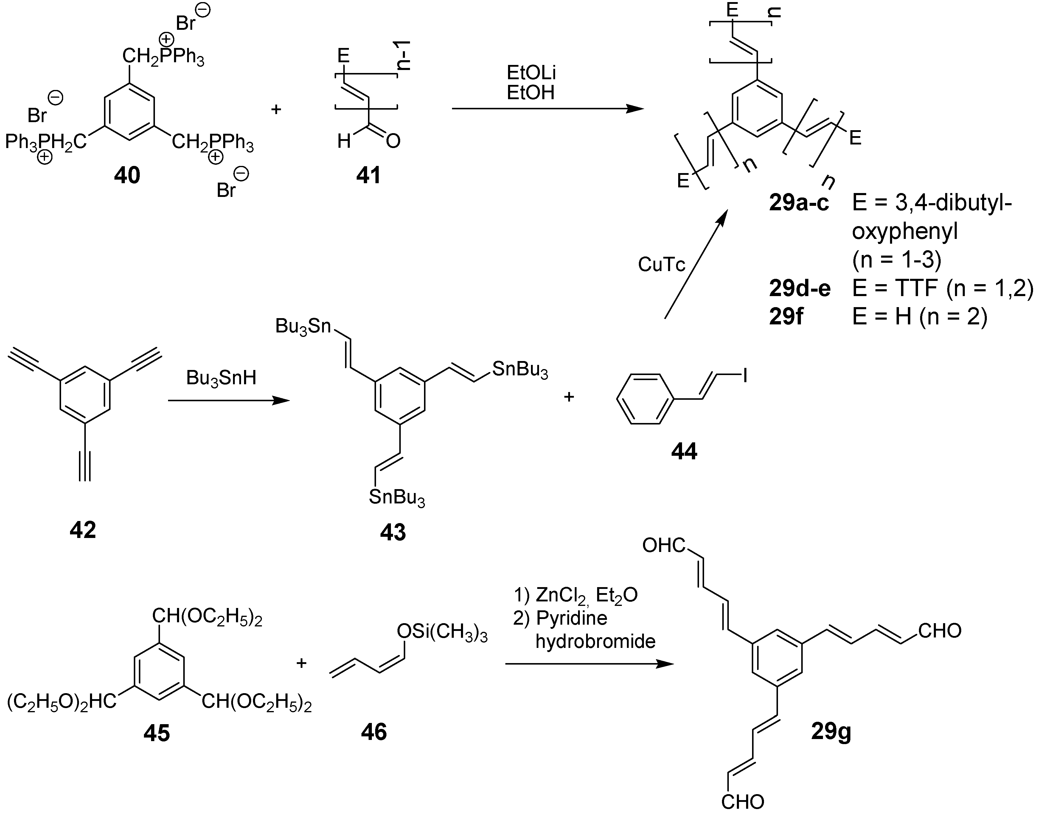 The synthetic approach to the star-shaped conjugated oligomers CAm comprises convergent and divergent strategies, protecting group techniques and orthogonal techniques-like in the other classes of conjugated oligomers [1,2,3,4,5,6,7,8,9,10,11,12,13,14,15,16,17,18]. Most important are catalyzed CC coupling reactions, such as Heck, Sonogashira or Suzuki reactions. Condensation reactions for the generation of CC double bonds and oxidative couplings of terminal alkynes play also an important role in this context.