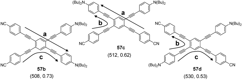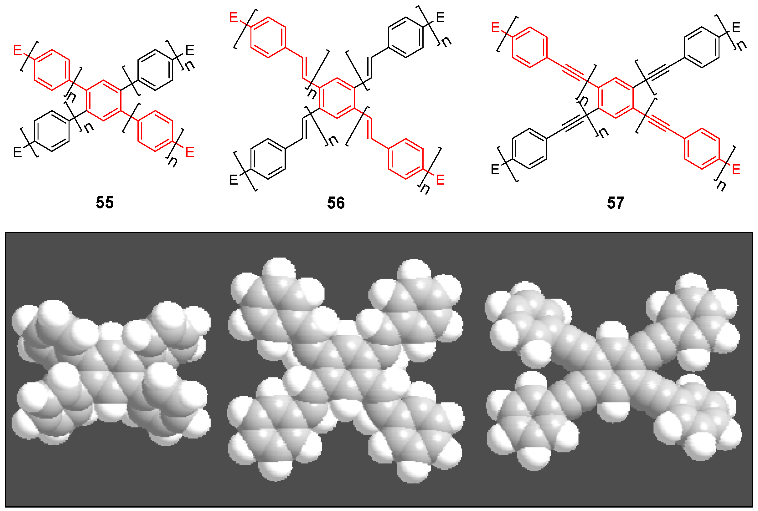 Detailed DFT studies on 1,4-phenylene-ethynylene and 1,4-phenylene-butadiynylene chains revealed that a sufficiently large ϕ between two successive segments breaks the through-bond and through-space conjugation and yields weakly coupled chain segments as chromophoric units [25,26,27]. The corresponding function of the electronic coupling EC (ϕ) has an inflection point whose value ϕ can be used as cutoff angle for the conjugation. Due to the dilution of the wave function for increasing segment length, the cutoff angles decrease with increasing numbers n of repeat units. Thus, the effective conjugation length in the arm of a compound CAm≡C(RnE)m can be smaller than n. In addition to this effect of statistical torsions, the conjugation of planar as well as non-planar arms shows a saturation phenomenon as any conjugated oligomer chain [14,28]. The effective conjugation length nECL defines the number of repeat units, whose exceeding does not lead to a further change of properties such as absorption, fluorescence, etc. [28]. The convergence effect is a consequence of different bond lengths and resonance integrals in the chain. Torsions along the chain accelerate this convergence, real kinks can stop the conjugation [14].