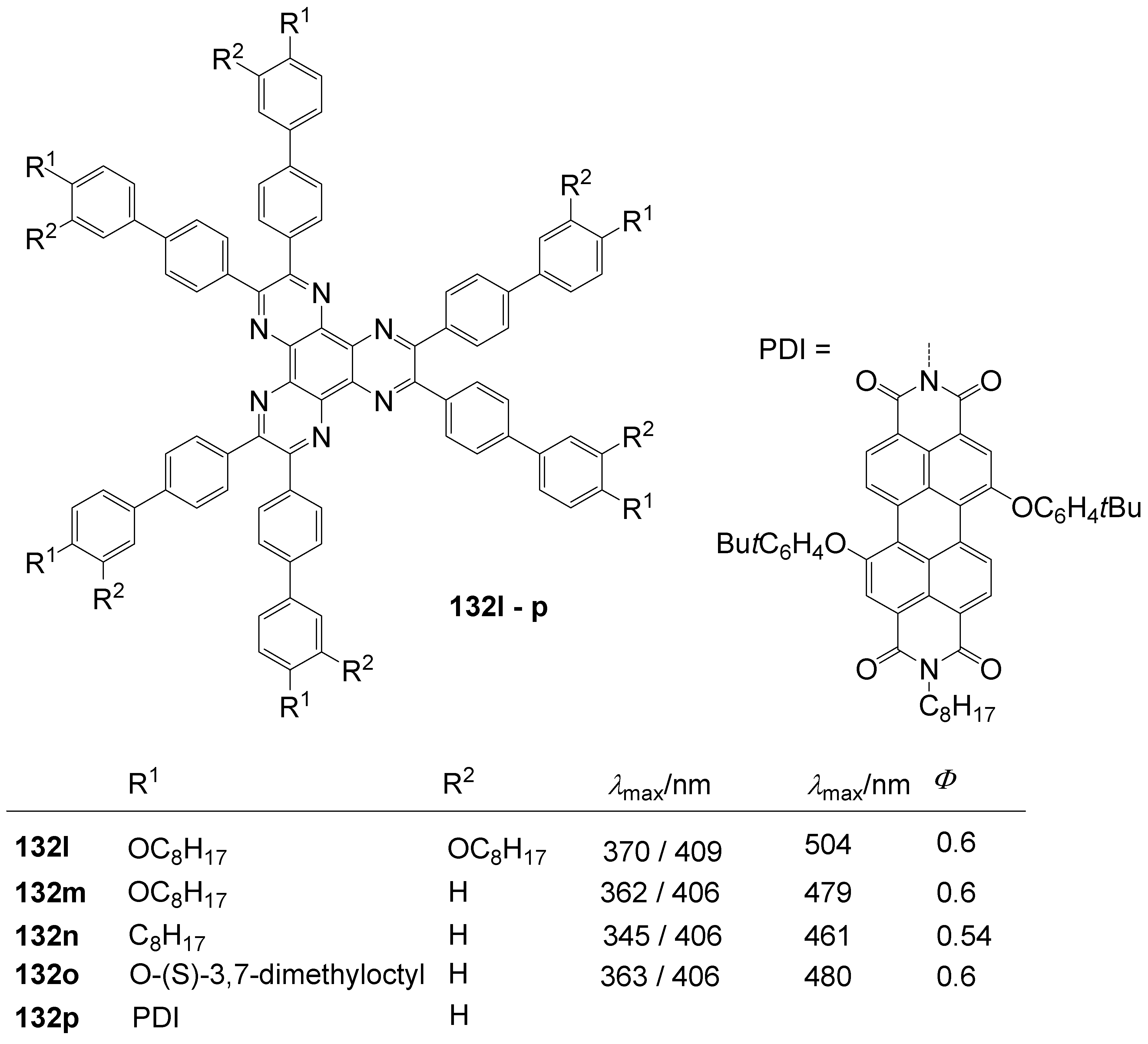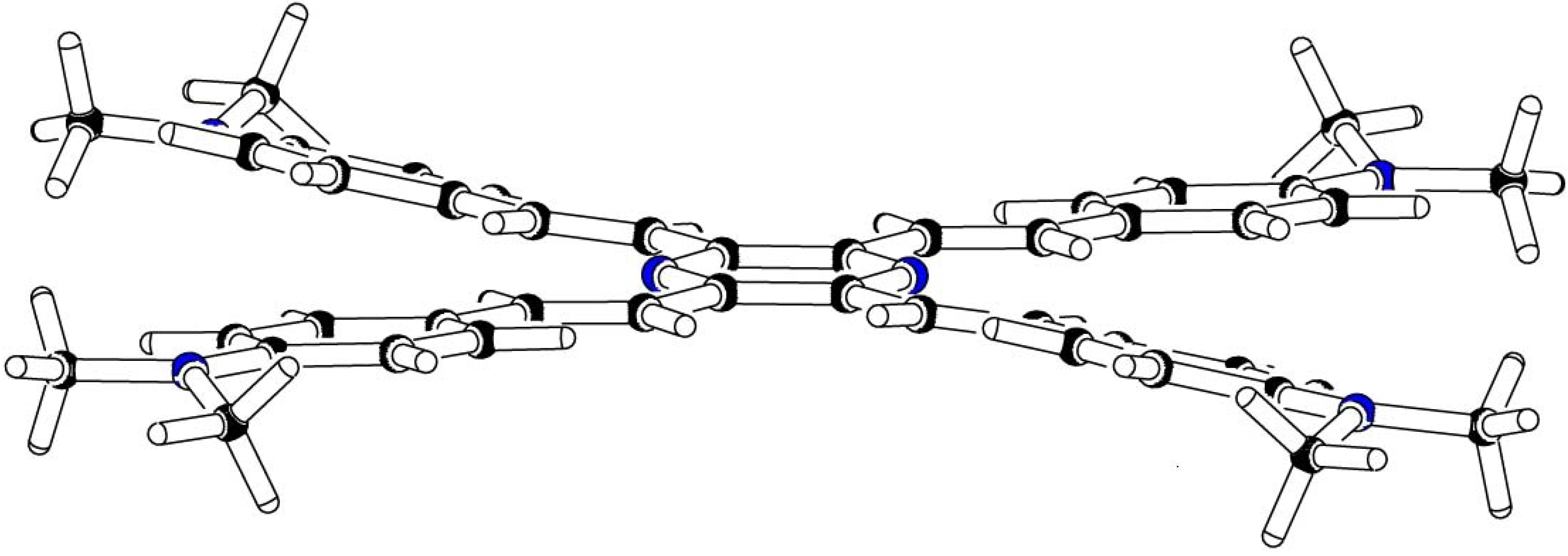 All other cores C-4−C-12 are planar rings or ring systems. Three, four or six attached benzene rings lead to twist angles ϕ , which represent a compromise between the maximum conjugation for ϕ = 0° and minimum steric interaction for ϕ = 90°. Other bond rotations in the arms A-1−A-9 have very low energy barriers. The corresponding minima on the energy hypersurface are located in flat wells of planar conformations.