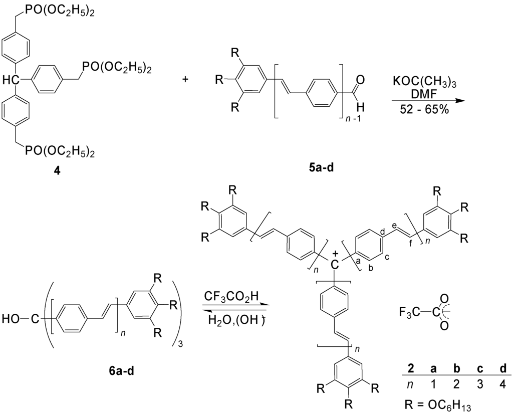 A detailed study of the conjugation effect in 2 with extended arms (n = 1-4) was made by Meier et al. [41,42]. The carbinols 6a-d were prepared by Wittig-Horner reactions of the triphosphonate 4 and the aldehydes 5a-d and spontaneous autoxidation at the central carbon atom. Treatment of 6a-d with CF3COOH yielded the methylium salts 2a-d (Scheme 1).