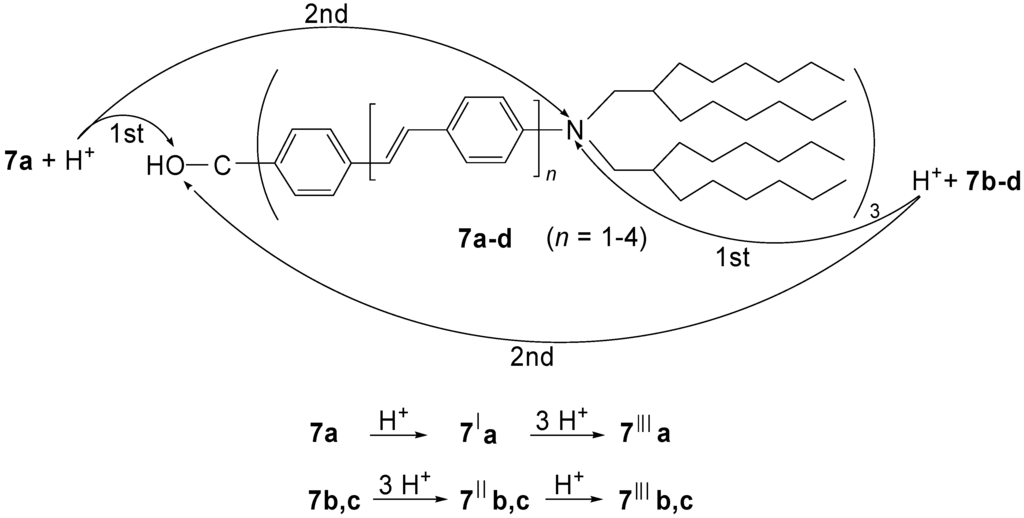 When dialkylamino groups, such as the solubilizing bis(2-hexyloctyl)amino group, are attached in p-position of the terminal benzene rings, the situation is more complex (Scheme 2) [42]. The lowest generation 7a (n = 1) forms first by O-protonation and elimination of water the corresponding methylium salt 7′a before the successive three-fold N-protonation to 7′′′a occurs. The higher members 7b,c (n = 2, 3) are first N-protonated to the carbinols 7″b,c before the methylium ions 7′″b,c are generated. The methylium ion 7′a is a star-shaped push-pull system with an absorption, which reaches far into the NIR region (λmax = 1100 nm). Its extended conjugation causes such an enormous bathochromic shift in comparison to tris(4-dimethylaminophenyl)methylium ions (Crystal Violet: λmax = 590 nm). The push-pull effect disappears as soon as (threefold) N-protonation occurs. The tetracations 7′′′a-c have absorption maxima in the visible region (λmax = 622, 740 and 790 nm, respectively). They represent a bathochromic oligomer series with a convergence limit of λ∞ = 827 nm. Figure 7 demonstrates the generation-dependent protonation behavior by the different red- and blue-shifts in the absorption spectra.