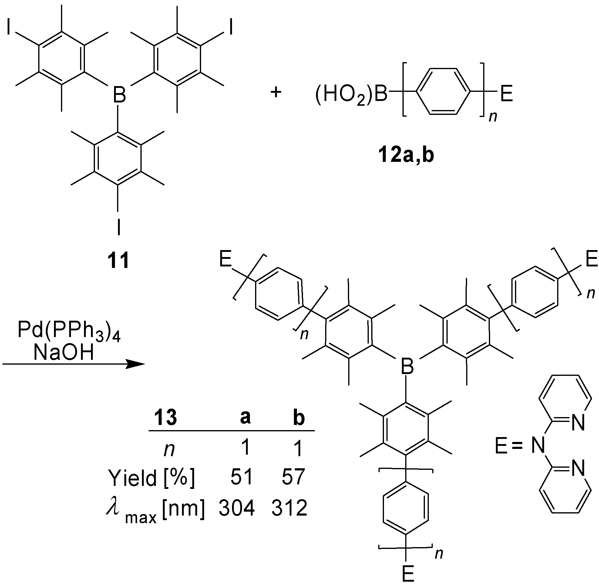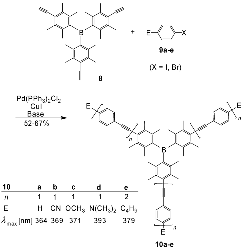 Planar trigonal boron centers seem to be ideal cores for [3]star oligomers, since the empty pπ orbital of the boron atom guarantees an efficient conjugation. This is particularly valid for the pπ-π* interaction in the LUMO. The resulting low-lying LUMOs cause low reduction potentials and favor therefore n-doping and good electron-transporting properties. Moreover, the electropositive character of B should enable an intramolecular charge transfer from electron-rich π-conjugated arms to the center. However, the high sensitivity of boranes toward air and water is normally a big disadvantage for their application. Yamaguchi, Tamao et al. [43] overcame this problem by the introduction of durenylene groups, which provoke a kinetic stabilization by steric shielding of the reactive B center. The compounds 10a-e were obtained by Sonogashira-Hagihara reactions (Scheme 3).