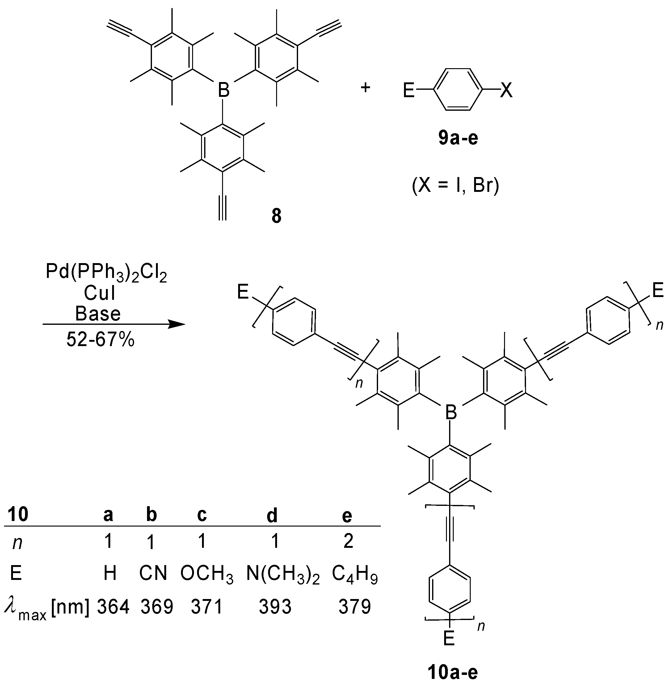 Preparation of the triarylboranes (10a-e) with extended conjugation. Absorption maxima in THF.