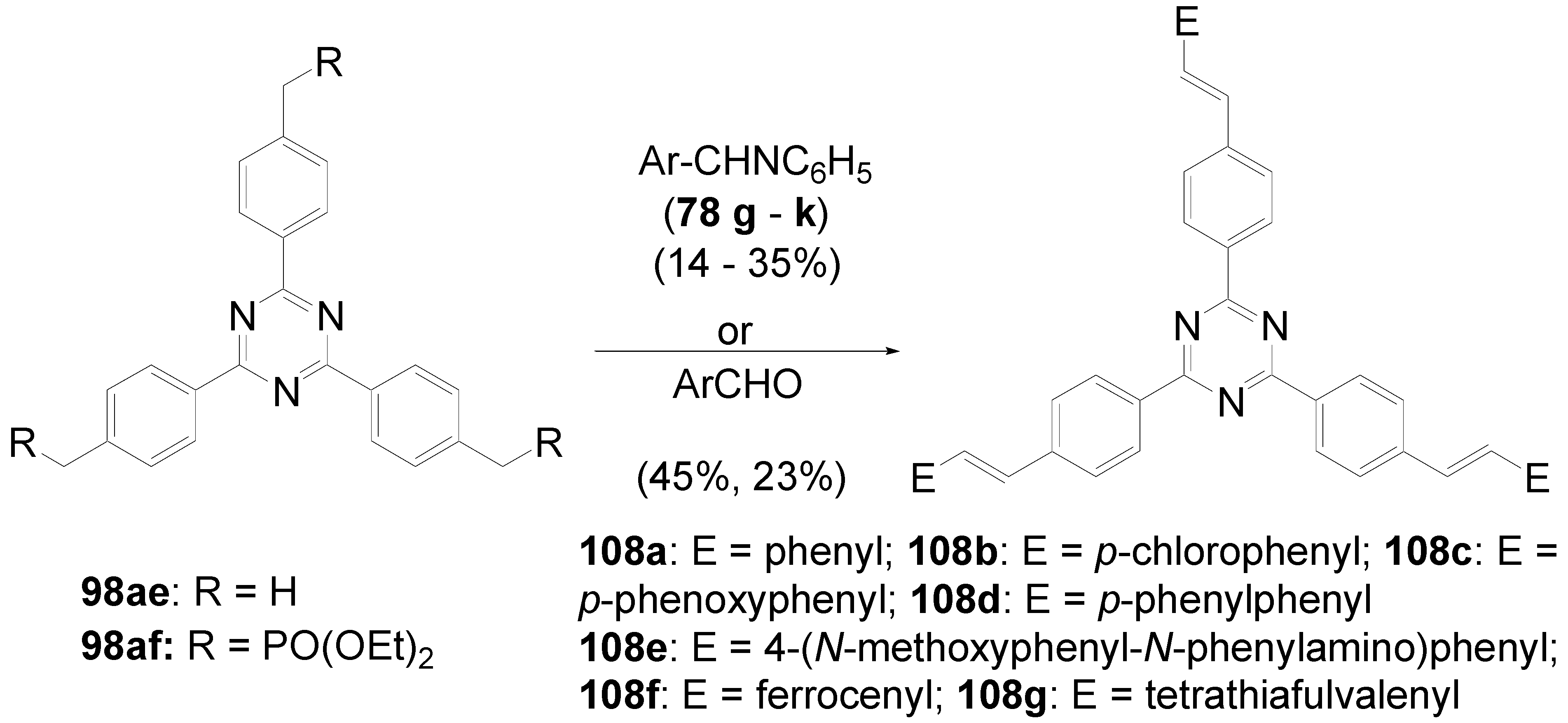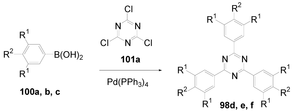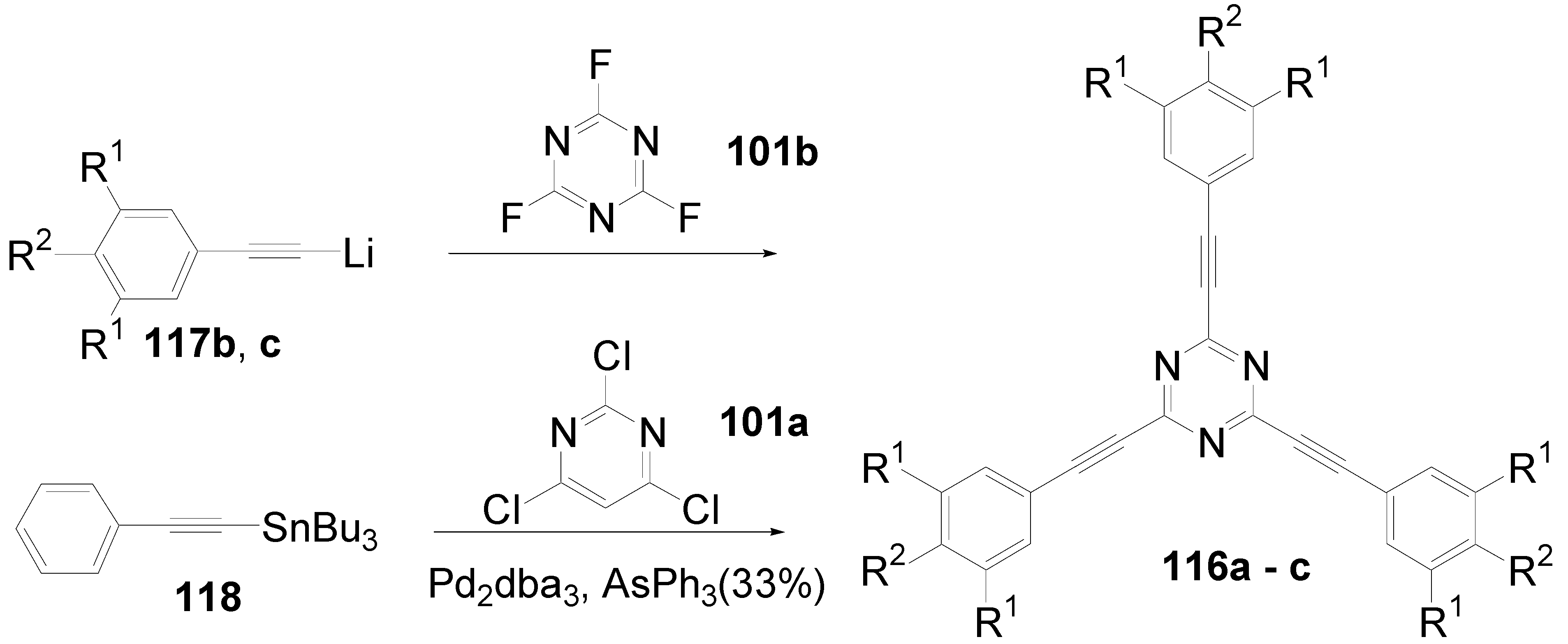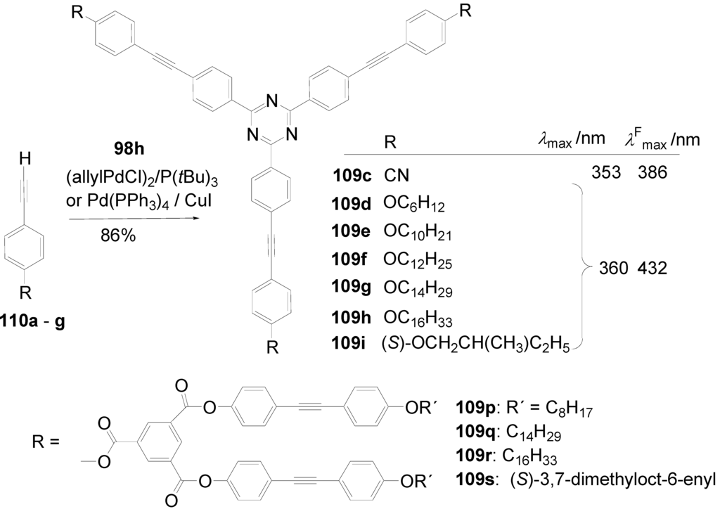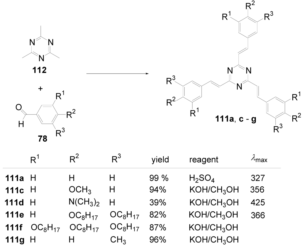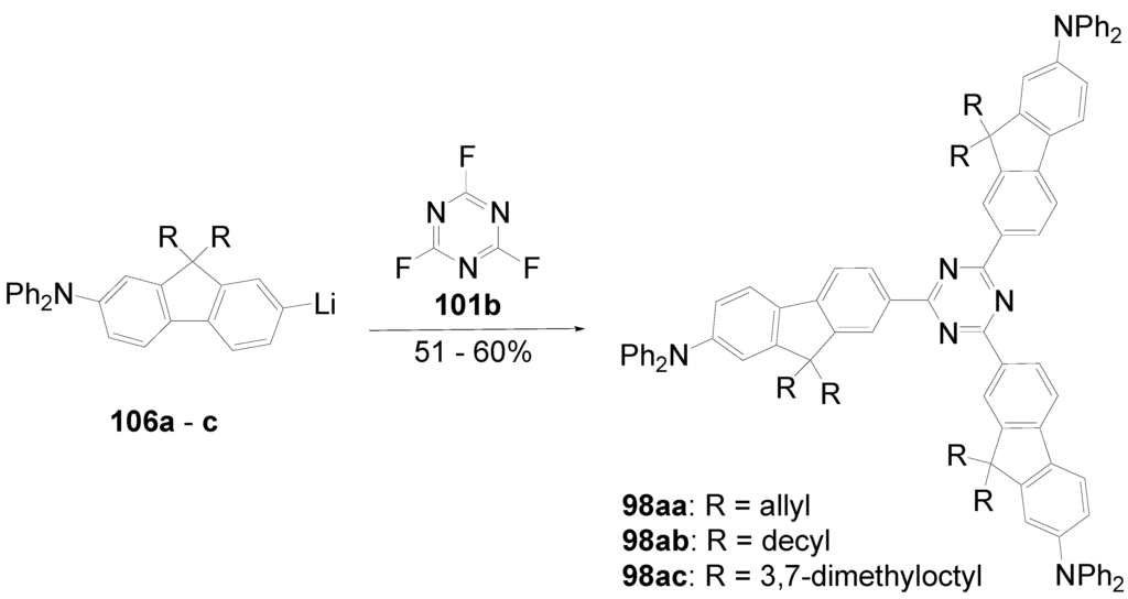 - Meier, H.; Holst, H.C.; Oehlhof, A. Star-shaped Compounds Having 1,3,5-triazine Cores. Eur. J. Org. Chem. 2003, 4173–4180. [Google Scholar]