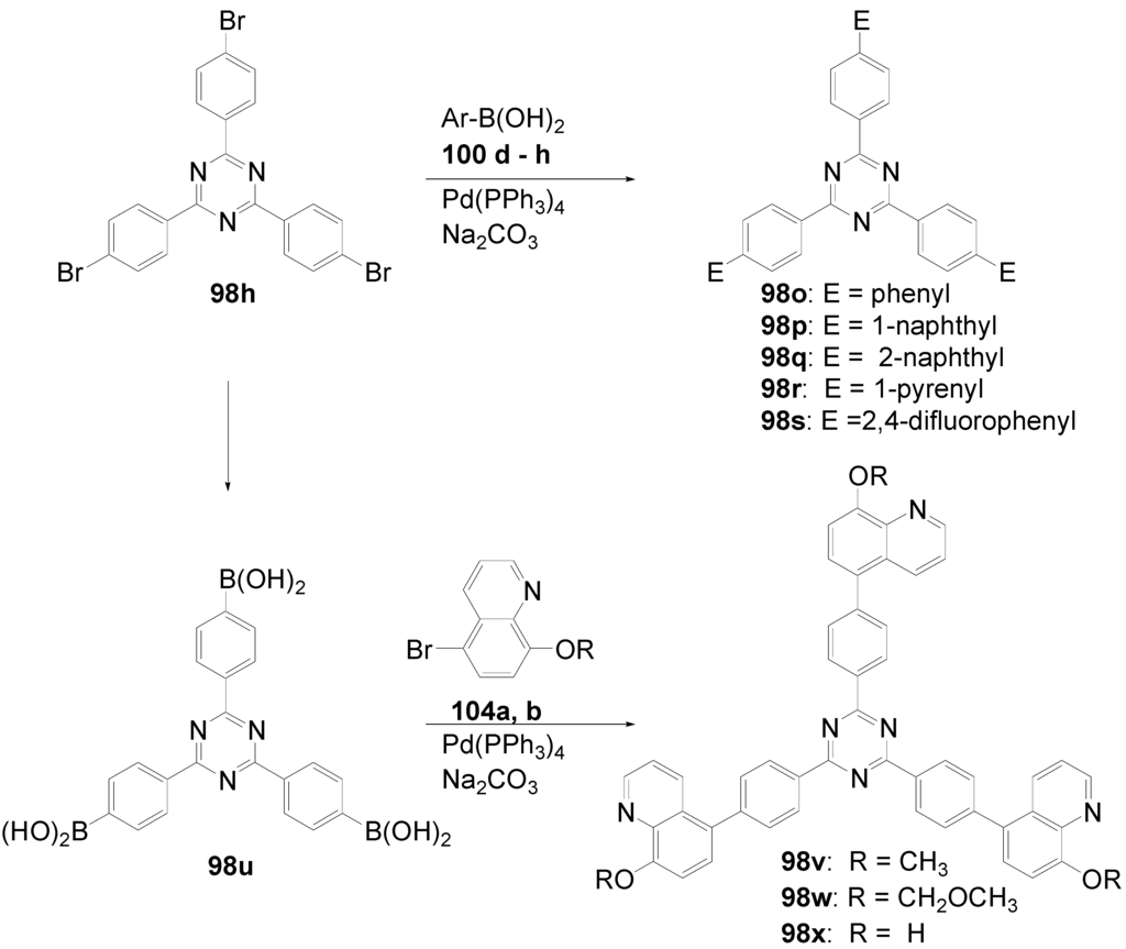 - Lai, W.-Y.; Chen, Q.-Q.; He, Q.-Y; Fan, Q.-L.; Huang, W. Microwave-enhanced multiple Suzuki couplings toward highly luminescent starburst monodisperse macromolecules. Chem. Comm. 2006, 1959–1961. [Google Scholar] [CrossRef]