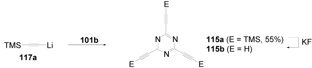 - Kouvetakis, J.; Grotjahn, D.; Becker, P.; Moore, S.; Dupon, R. Synthesis of Ethynyl-Substituted Precursors to Carbon-Nitrogen-Sulfur Extended Structures: Reaction of C3N3F3 and C2N2SCl2 with Alkali-Metal (Trimethylsilyl)acetylides. Chem. Mater. 1994, 6, 636–639. [Google Scholar] [CrossRef]