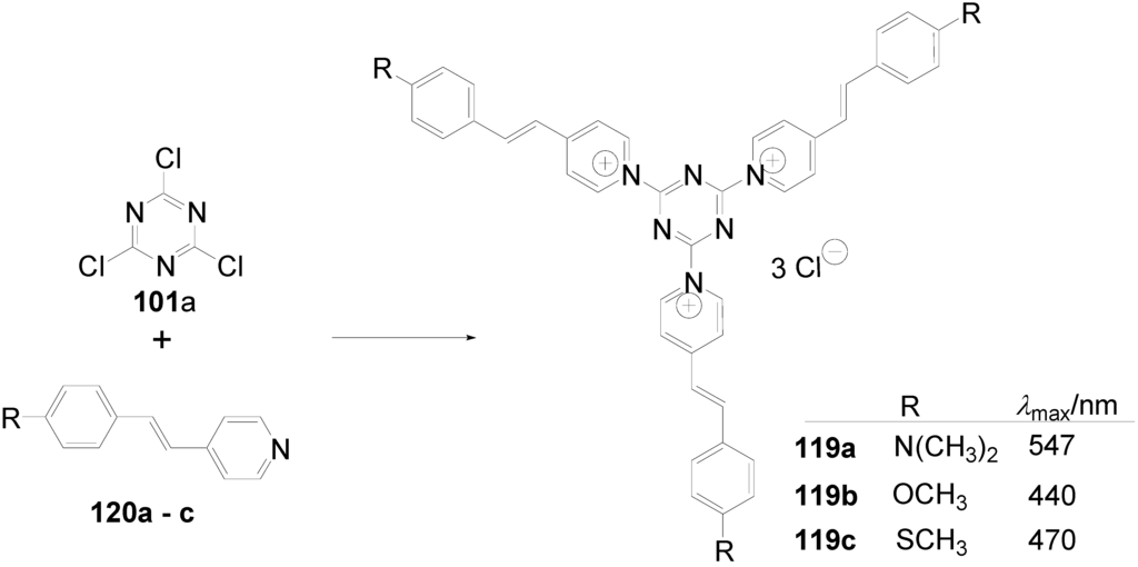 - Meier, H.; Karpouk, E.; Holst, H.C. Star-shaped Push-Pull Compounds Having 1,3,5-Triazine Cores. Eur. J. Org. Chem. 2006, 2609–2617. [Google Scholar] [CrossRef]