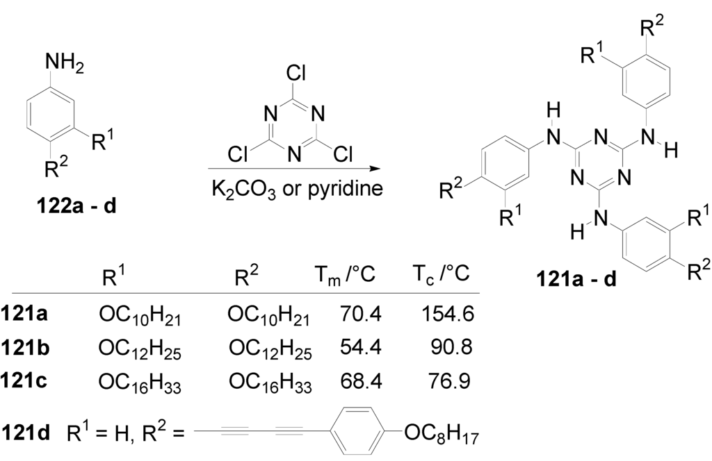 - Janietz, D.; Goldmann, D.; Schmidt, C.; Wendorff, J.H. Control of mesomorphic structures of 1,3,5-triazines through molecular shape and intramolecular functionalization. Mol. Cryst. Liq. Cryst. A 1999, 332, 2651–2658. [Google Scholar]