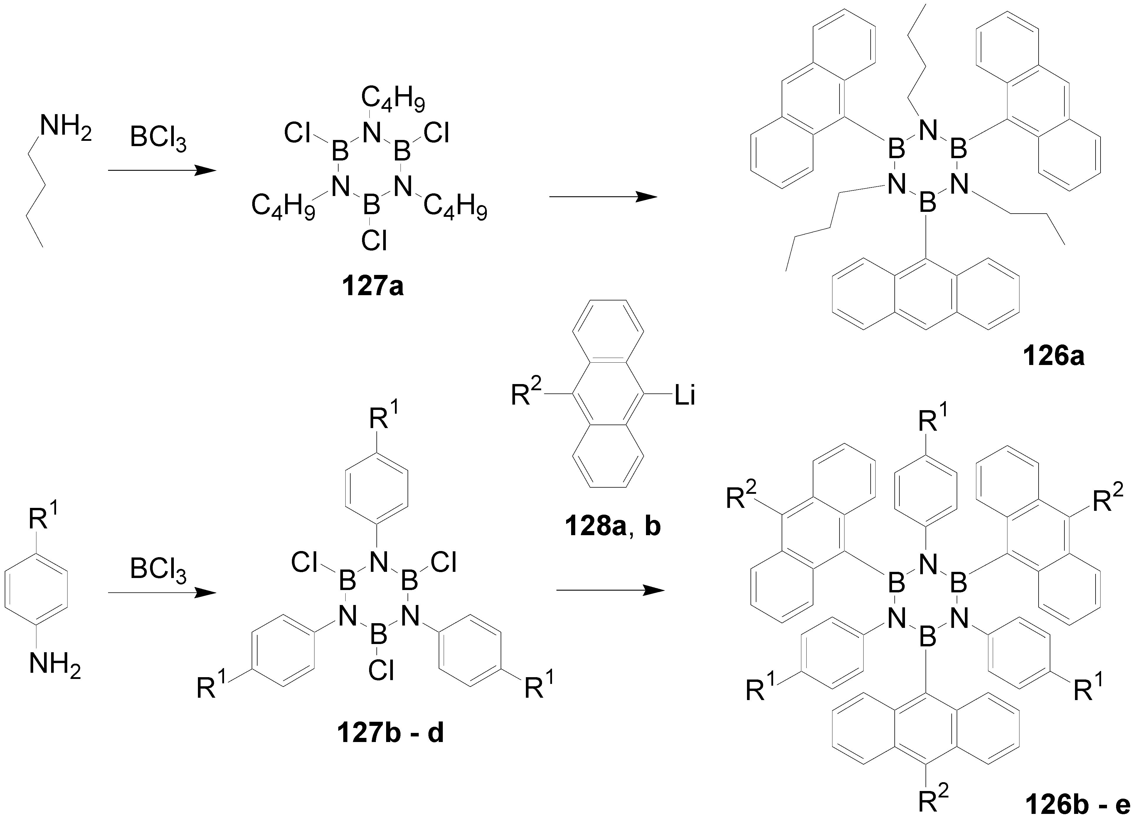 - Wakamiya, A.; Die, T.; Yamaguchi, S. Toward π-Conjugated Molecule Bundles: Synthesis of a Series of B,B´,B´´-Trianthryl-N,N´N´´-triarylborazines and the bundle effect of their properties. J. Am. Chem. Soc. 2005, 127, 14859–14866. [Google Scholar] [CrossRef]