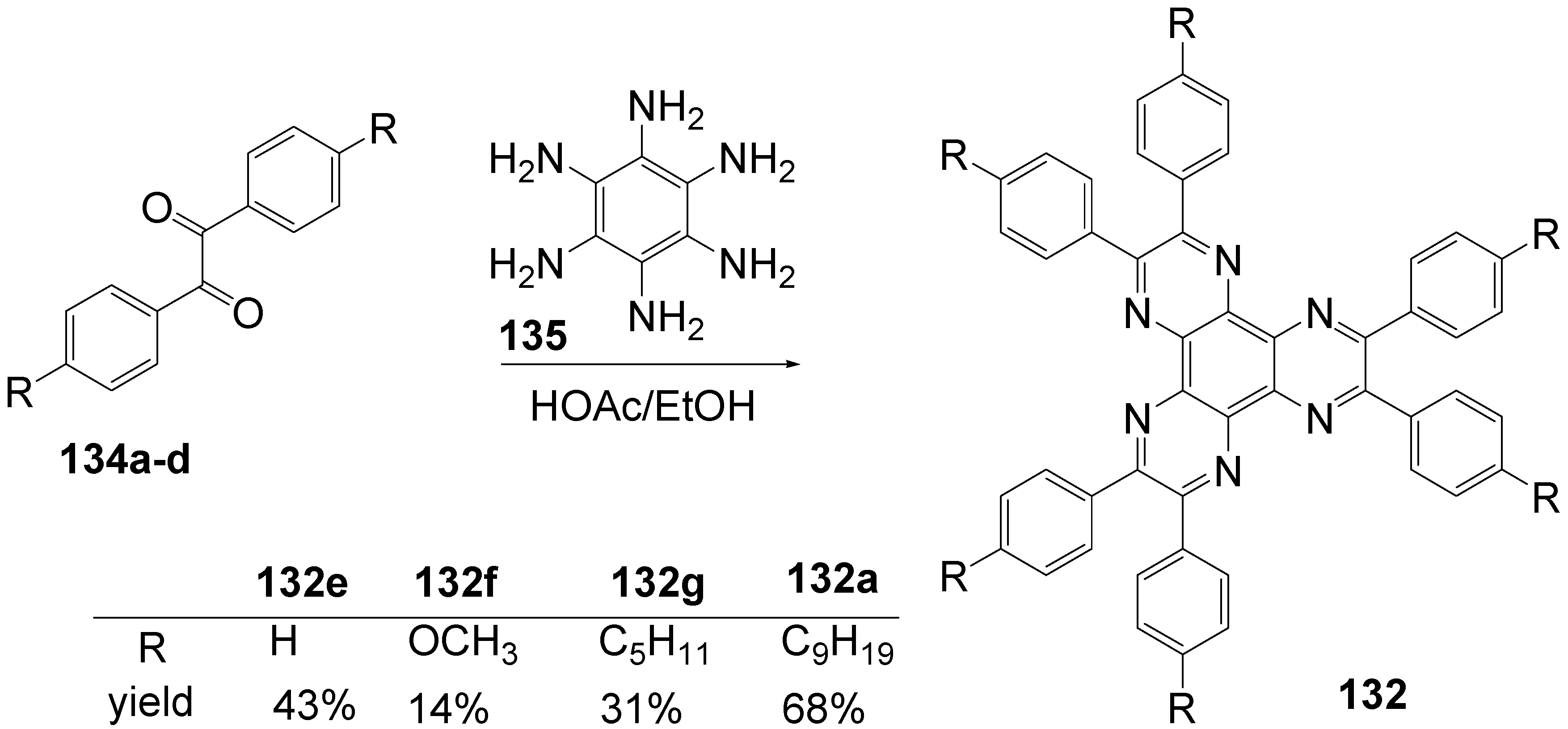 - Kohne, B.; Praefcke, K. Eine neue und einfache Synthese des Dipyrazino[2,3-f: 2´,3´-h]-chinoxalin-Ringsystems. Liebigs Ann. Chem. 1985, 522–528. [Google Scholar] [CrossRef]