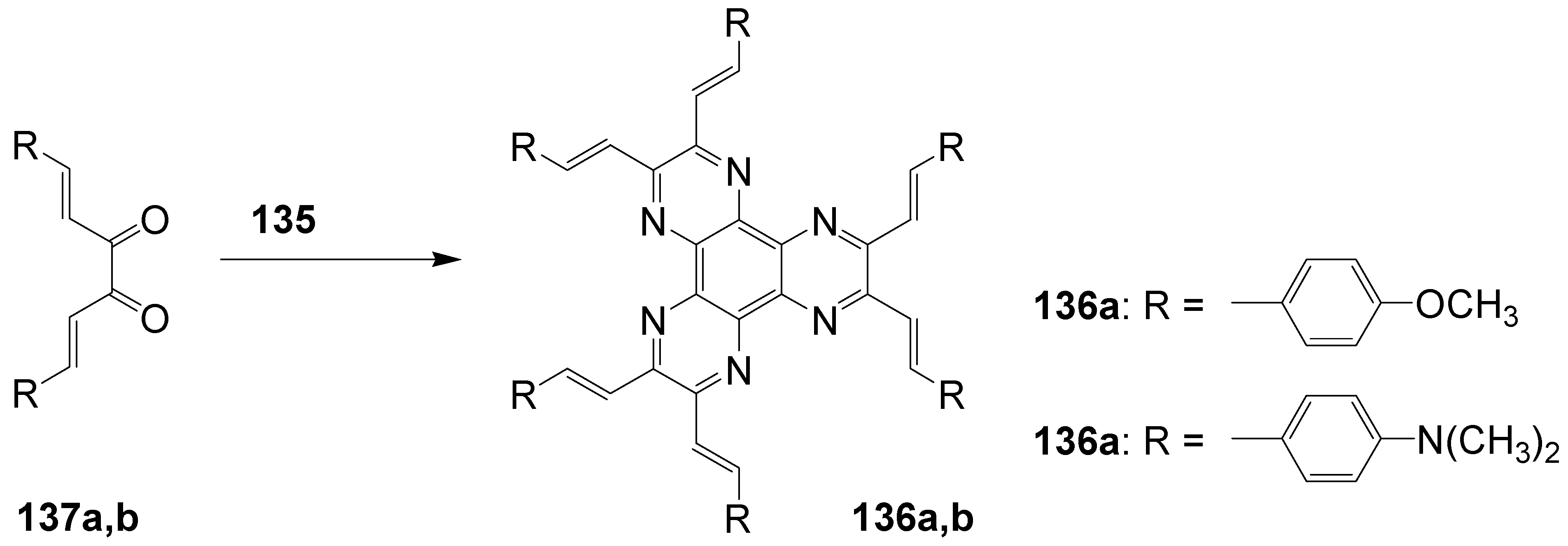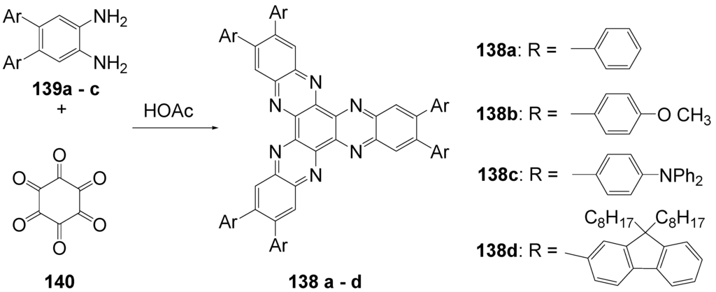 - Gao, B.; Liu, Y.; Geng, Y.; Cheng, Y.; Wang, L.; Jing, X.; Wang, F. Starburst substituted hexaazatriphenylene compounds: synthesis, photophysical and electrochemical properties. Tetrahedron Lett. 2009, 50, 1649–1652. [Google Scholar] [CrossRef]