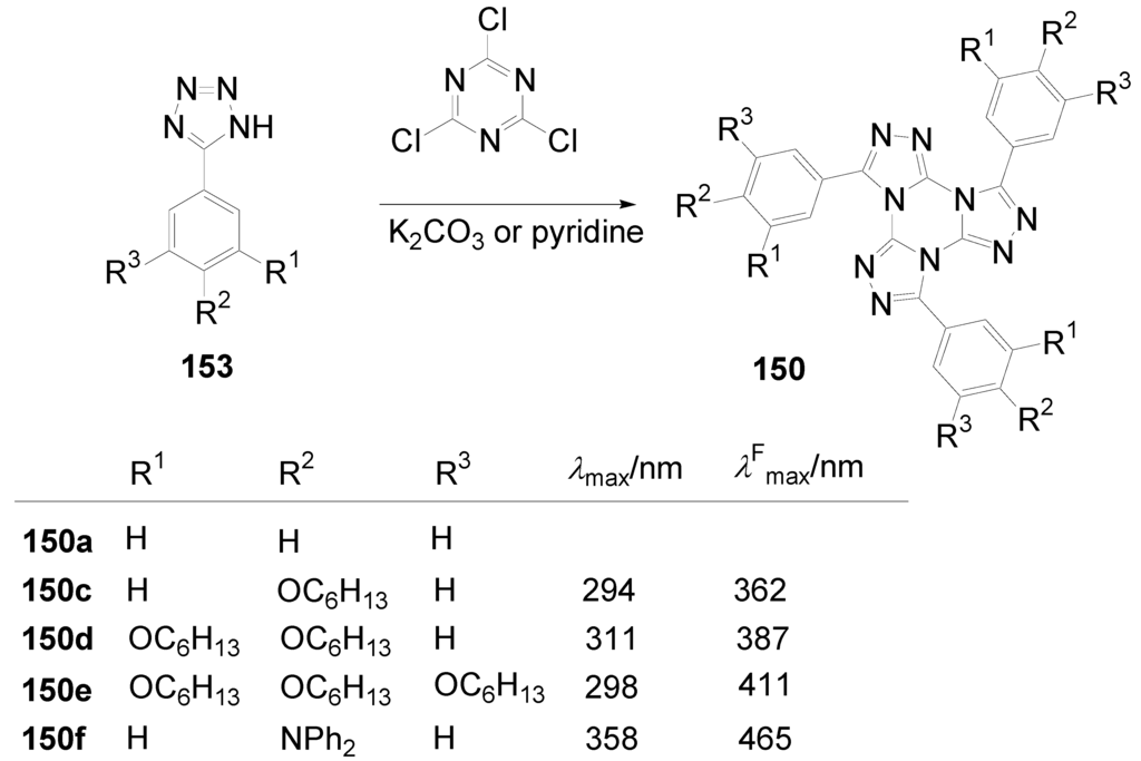 - Glang, S. Donorsubstituierte Tristriazolotriazine-Diskotische Flüssigkristalle und octupolare Fluoreszenzfarbstoffe. PhD thesis, University of Mainz, Germany, 2009. [Google Scholar]