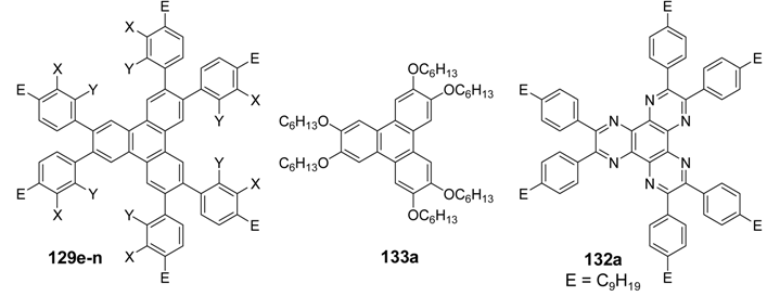 - Cammidge, A.N.; Bushby, R.J. Discotic Liquid Crystals- Synthesis and Structural Features. In Handbook of Liquid Crystals; Demus, D., Goodby, J.W., Gray, G.W., Spiess, H.W., Vill, V., Eds.; VCH: Weinheim, Germany, 1998; Volume 2b, pp. 693–748. [Google Scholar]
