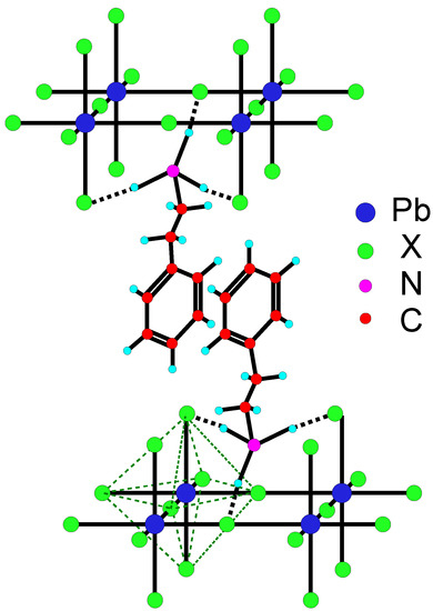 Figure 1 illustrates the structure of the (CHCHNH)PbX (X=I, Br, or Cl) 2DOIPs. Since 2-phenylethanamine is frequently used as the organic group of the 2DOIPs in this paper, we note (CHCHNH) as PhE hereafter for convenience. For example, (CHCHNH)PbI will be referred as PhE-PbI. As illustrated in Figure 1, each metal atom and its 6 neighbouring halide atoms form a MX octahedron. The octahedrons constitute an inorganic layer by sharing the halide atoms with its neighboring octahedrons in 2 dimensions [13,14,15,16,17]. Organic ammonium salts can bind to the inorganic layers and form an intercalated 2D organic-inorganic layers structure.