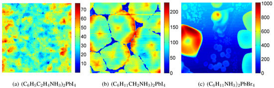 Atomic force microscopy (AFM) is a powerful tool for determining the surface topography with nanometer scale resolution [31,32,33]. Depending on the organic and inorganic components of 2DOIPs, their self-organized structure on substrate may be very different. The self-organized structure can be comparatively studied by AFM. Figure 3 presents the topography of three different 2DOIPs on glass substrate. The topographies of these films are very different. The maxima in height are 74 nm (a), 230 nm (b), and 998 nm (c), respectively. It can be seen that the surface of Figure 3(a) is fully covered by (CHCHNH)PbI. If we define the height less than 10% of the maximum of topography is not covered by 2DOIP, the surface coverage can be found to be 97% and 76% for Figure 3(b) and Figure 3(c), respectively. The difference is related to the nature of the organic components [20]. In the bi-organic layer 2DOIPs, the organic groups interact with each other to form a self-organized structure. For example, the organic component is 2-phenylethanamine in PhE-PbI, it is known that there exists - interactions between adjacent phenyl groups, leading to a good film quality for PhE-PbI. The organic component is cyclohexylmethanamine in (CHCHNH)PbI, the interaction between the organic components consists in weak van der Waals forces, thus the (CHCHNH)PbI film is discontinuous and more rough. The organic component is cyclohexanamine in (CHNHPbBr. The ammonium unit penetrates into the inorganic sheets when it binds to the metal halide octahedron through hydrogen bonding, a spacer is needed when the organic group is too large to fit into the hole within the inorganic sheet. From geometric calculations it is possible to see that the distance between the ammonium unit and cyclohexane is too short, the consequence is an increase of the roughness of the (CHNHPbBr thin films [20].
