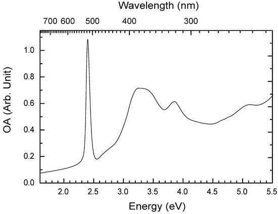 Figure 9 presents the OA spectrum of a 50-nm-thick PhE-PbI film measured at 10 K. The PhE-PbI film was prepared by spin-coating 0.1 mol L perovskites in DMF on quartz slide at 2000 rpm for 30 seconds. The low temperature OA spectrum was measured by a home-made experimental setup. Light from a Xenon lamp was coupled through an optical fiber into a monochromator. The monochromatic light was then collimated by a fused silica lens and passed through the sample, which was settled on the cold finger of a cryostat. One quartz slide was introduced into the optical path before the cryostat to reflect a small portion light as a reference. The intensity of the reflected reference light () and the intensity of the light passed through the sample () were collected by two identical photomultipliers (PMT). Signals of the two PMT were acquired by two lock-in amplifiers, connected to a computer through GPIB interfaces. A clean quartz substrate was firstly installed on the cold finger of the cryostat, and PMT signals of reference light () and transmitted light () were recorded as a function of light wavelength (). Then the 2DOIP sample was installed on the cold finger of the cryostat, and PMT signals of the reference light () and transmitted light () were recorded at low temperature. The OA spectrum is obtained by OA() = . Effect of intensity fluctuations of the light source was removed in this two PMT configuration.