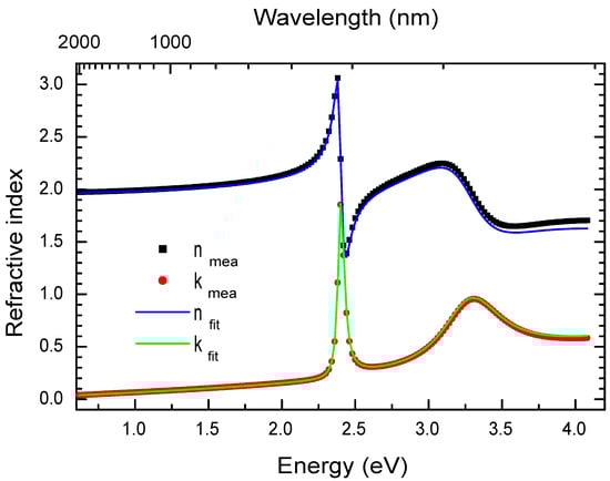 Refractive index () of PhE-PbI film measured by ellipsometry. The 200-nm-thick PhE-PbI film was spin-coated on silicon substrate. The black squares and red dots represent the real () and imaginary () parts of the experimentally measured refractive index, respectively. The blue and green solid lines present the fit to the experimental data with the Equation 7 and the parameters reported in Table 1.