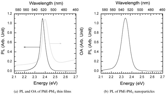 For the 2DOIPs that present a characteristic absorption peak related to the 2D arrangement, some of them may have very efficient luminescence (such as the (CHCHNHPbBr in ref [20]), but some of them does not have luminescence (such as the (CHNHPbBr in ref [20]). Photoluminescence (PL) spectrum gives a direct characterization of the luminescence ability of the 2DOIPs. Figure 7 shows the PL spectra of a 50-nm-thick PhE-PbI thin films (a), and of PhE-PbI nanoparticles (b) measured at room temperature. The PL was excited with the 325 nm line of a HeCd laser, was collected by an optical lens and was coupled into a spectrometer. Figure 8 shows pictures of the photoluminescence of a thin film and of nanoparticles. The PL of the PhE-PbI thin film consists in a bright green light centered at 2.375 eV ( = 522 nm ). The full width at half maximum (FWHM) of the PhE-PbI thin film is 51 meV, which is much narrower than that of some luminescent organic polymers and laser dyes. OA spectrum of the PhE-PbI film is also shown in Figure 7(a) in gray for comparison. Stokes shift is defined as the energy difference between absorption and PL maxima. The Stokes shift in 2DOIPs is usually very small, it is only 24 meV in PhE-PbI thin film.