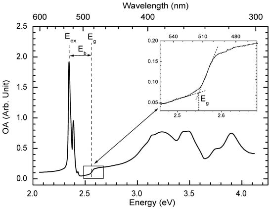 Optical absorbance (OA) spectrum of 50-nm-thick PhE-PbI film measured at 10 K. The inset is a zoom of the square zone. E, E, and E represent the exciton energy, the enery gap, and the exciton binding energy, respectively.