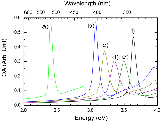 In a similar way, changing the halogen X can also change the optical properties of the 2DOIPs. Figure 10 presents the OA spectra of PhE-PbX for different X. As shown by curves a), b), and f), when X is changed, the excitonic peaks of PhE-PbX locate at 2.40 eV, 3.08 eV, and 3.64 eV for X = I, Br, and Cl, respectively. The excitonic absorption peak of PhE-PbI is attributed to the electronic transition from Pb()-I() mixed states to Pb() state for PbI based 2DOIPs [37]. Similarly, the excitonic absorption peaks are due to the transition from Pb()-Br() states to Pb() state for PbBr based 2DOIPs [45], and from Pb()-Cl() states to Pb() state for PbCl based 2DOIPs [45].
