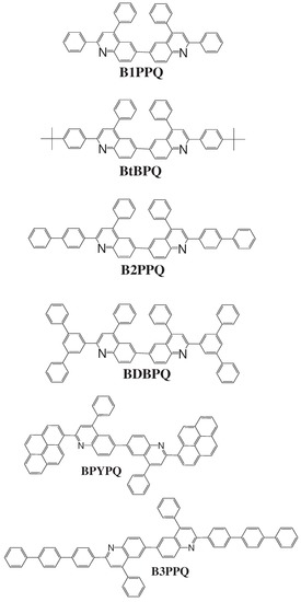 In recent years, these organic materials have been increasingly gaining popularity in the development of OLEDs. In particular, Jenekhe and collaborators [1,108] have synthesized a series of n-type blue-light-emitting π-conjugated oligomers [109] (see Figure 1). They found that these organic materials can be used to fabricate high-efficiency light-emitting diodes. These oligoquinolines, 6,6-bis(2,4-diphenylquinoline) (B1PPQ), 6,6-bis(2-(4-tert-butylphenyl)-4-phenylquinoline) (BtBPQ), 6,6-bis(2-p-biphenyl)-4-phenylquinoline)(B2PPQ), 6,6-bis((3,5-diphenylbenzene)-4-phenylquinoline) (BDBPQ), 6,6-bis(2-(1-pyrenyl)-4-phenylquinoline) (BPYPQ), and 6,6-bis(2-(1-triphenyl)-4-phenylquinoline) (B3PPQ) (See Figure 1 for molecular structures) exhibit many desirable properties of organic materials for developing high-performance light-emitting diodes: good blue color purity, high brightness, high efficiency, and high glass-transition temperatures. In particular, the two pyrenyl- and triphenyl-bearing oligoquinoline molecules BPYPQ and B3PPQ have many desirable properties such as excellent thermal stability, high melt transitions, high quantum yields, and bright blue electroluminescence with high efficiency, and are highly emissive electron transport materials for OLEDs and have been used as emitters in recent fabrication of OLED devices. The optical properties of these light-emitting oligomers such as absorption and emission spectra have been experimentally measured as well [1,108].