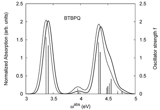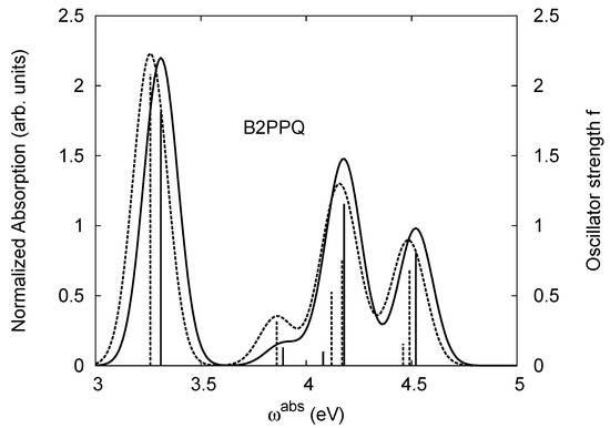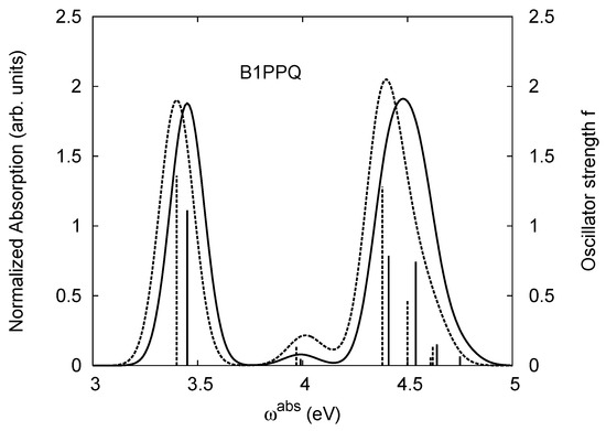 Experimental optical absorption [1] of B1PPQ has a second peak appearing at 4.43 eV. Our calculations consistently predict that two excited states with nearly the same oscillator strength contribute to the intensity of this peak. These states are separated by about 0.1 eV across all density functionals used. However, similar to the lowest state, the blueshift up to 1 eV is observed when going along the line of density functionals employed, from LSDA to PBE0. These two higher-lying states have very similar solvatochromatic shifts as well. Again, PBE0 provides the most accurate transition energy values when compared to the experimental data. It is interesting to note that the oscillator strength of these two higher-lying states grows dramatically in the hybrid functionals. We observe 4-6 fold increase when going from LSDA to PBE0. According to the LSDA (TPSS) results, the second peak magnitude should be much smaller compared to that of the first one. This is not, however, the case of experiment, where the second peak has larger amplitude compared to the first one [1]. PBE0 nearly captures the experimental observations. Figure 2 displays the oscillator strength of B1PPQ as a function of absorption frequency ω (solid “stick” in gas phase and dashed “stick” in solution) and our simulation of Equation (13) for the normalized absorption band intensity as a function of ω (solid curve in gas phase and dashed curve in solution) obtained from the PBE0 results. We note that the second peak has more intensity (integrated area under the curve), since it is composed from the two overlapping electronic transitions.
