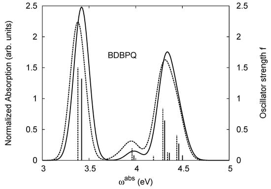 Normalized absorption I of Equation (13) (in arbitrary units) (right side) and oscillator strength f (left side) of B1PPQ. The solid and dashed curves represent the normalized absorption in gas phase and solution, while the solid and dashed “sticks” represent the oscillator strength in gas phase and solution, respectively. The absorption wavelength (in units of nm) may be obtained from the relation , where is the absorption frequency (in units of eV).