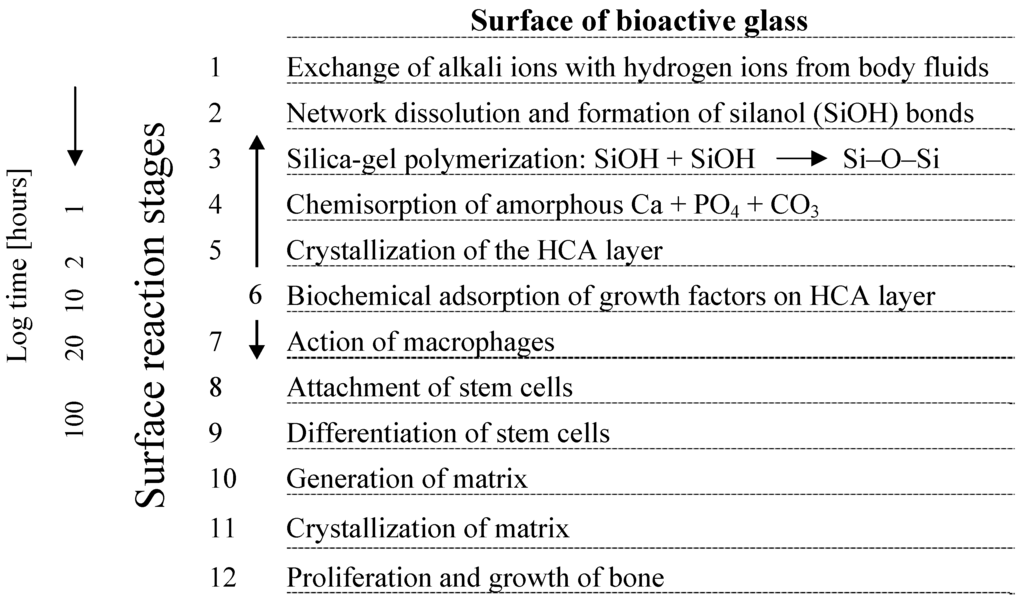 Sequence of interfacial reactions involved in forming a bond between bone and a bioactive glass (modified after reference [5]).